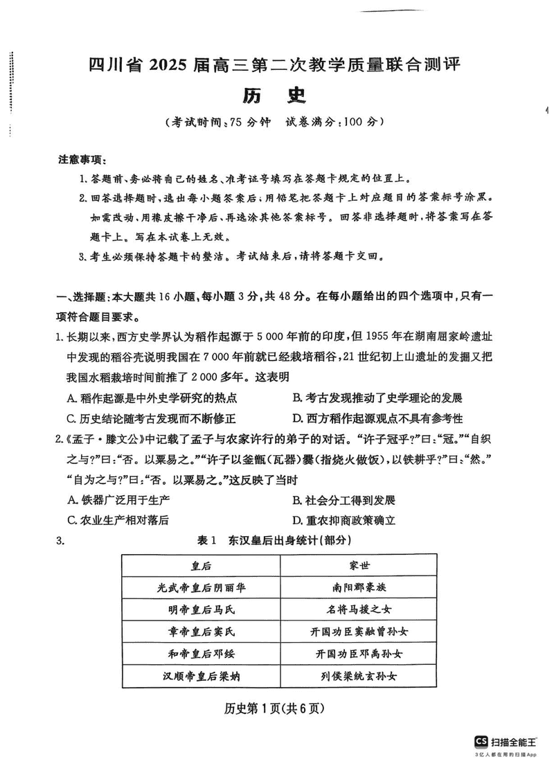 2025届四川高三第二次教学质量联合测评历史考试已于近日开考,为方便考生考后及时查看考试情况,查漏补缺、弥补不足,本文整理了试题答案解析相关信息!