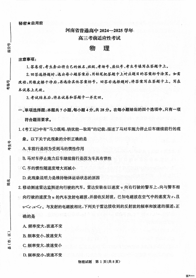 2025届河南青桐鸣5月高三考前适应性考物理考试已于近日开考,为方便考生考后及时查看考试情况,查漏补缺、弥补不足,本文整理了试题答案解析相关信息!