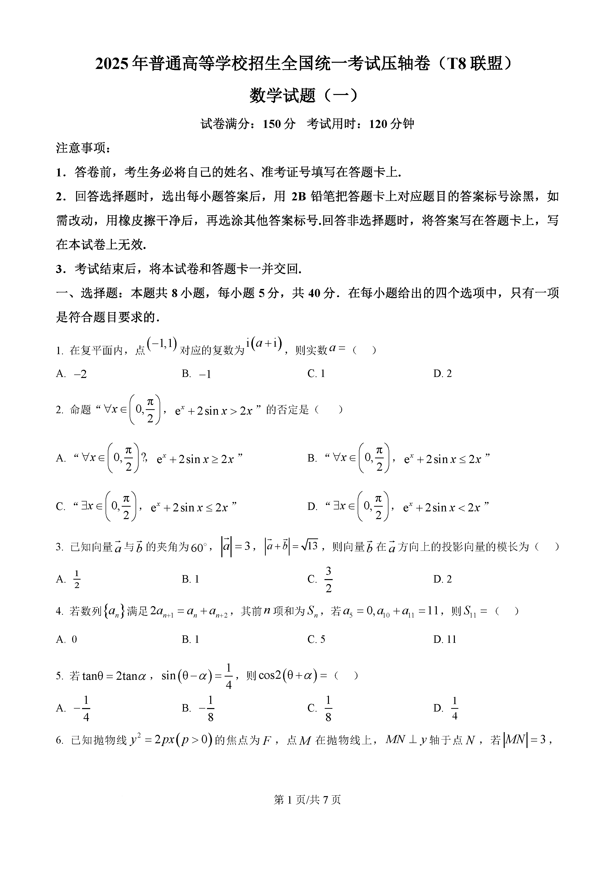 湖北省T8联盟2025届高三下学期高考考前模拟(一)数学试题及答案 时间:2025-05-17 湖北 数学试题 湖北省T8联盟2025届高三下学期高考考前模拟(一)数学考试已于近日开考,为方便考生考后及时查看考试情况,查漏补缺、弥补不足,本文整理了试题答案解析相关信息! 汇总: 数学试题及答案解析
