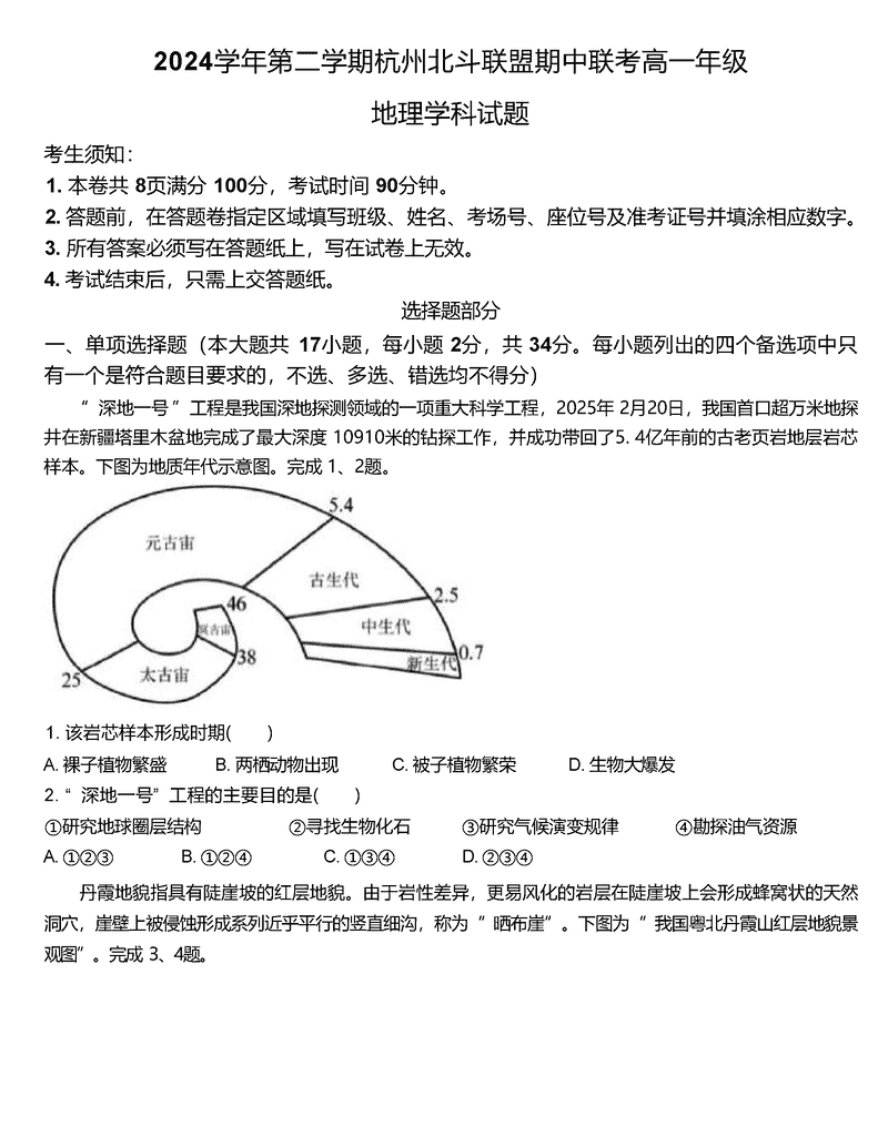 浙江省杭州市北斗联盟2024-2025学年高一下学期4月期中联考地理考试已于近日开考,为方便考生考后及时查看考试情况,查漏补缺、弥补不足,本文整理了试题答案解析相关信息!