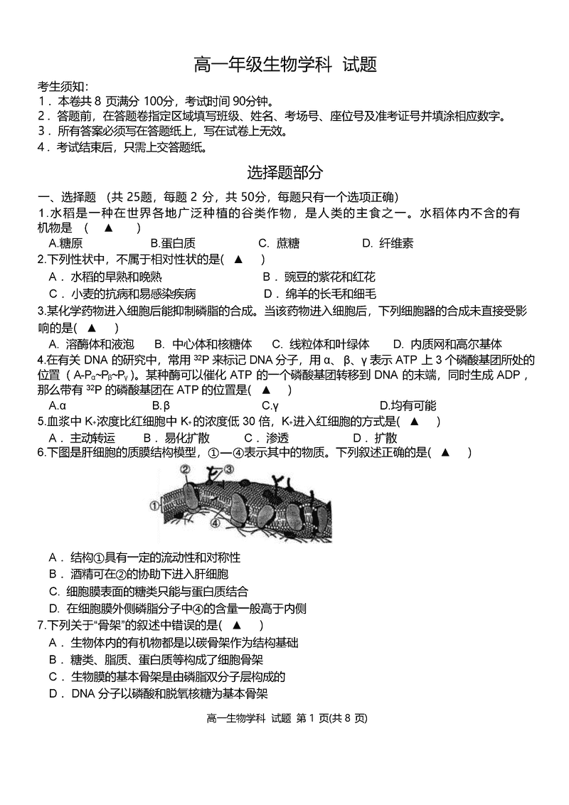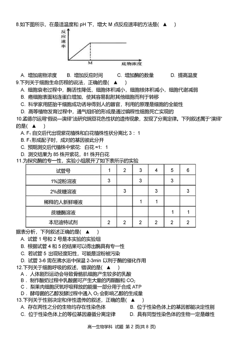 杭州北斗联盟2024-2025学年高一下4月期中联考生物试题及答案