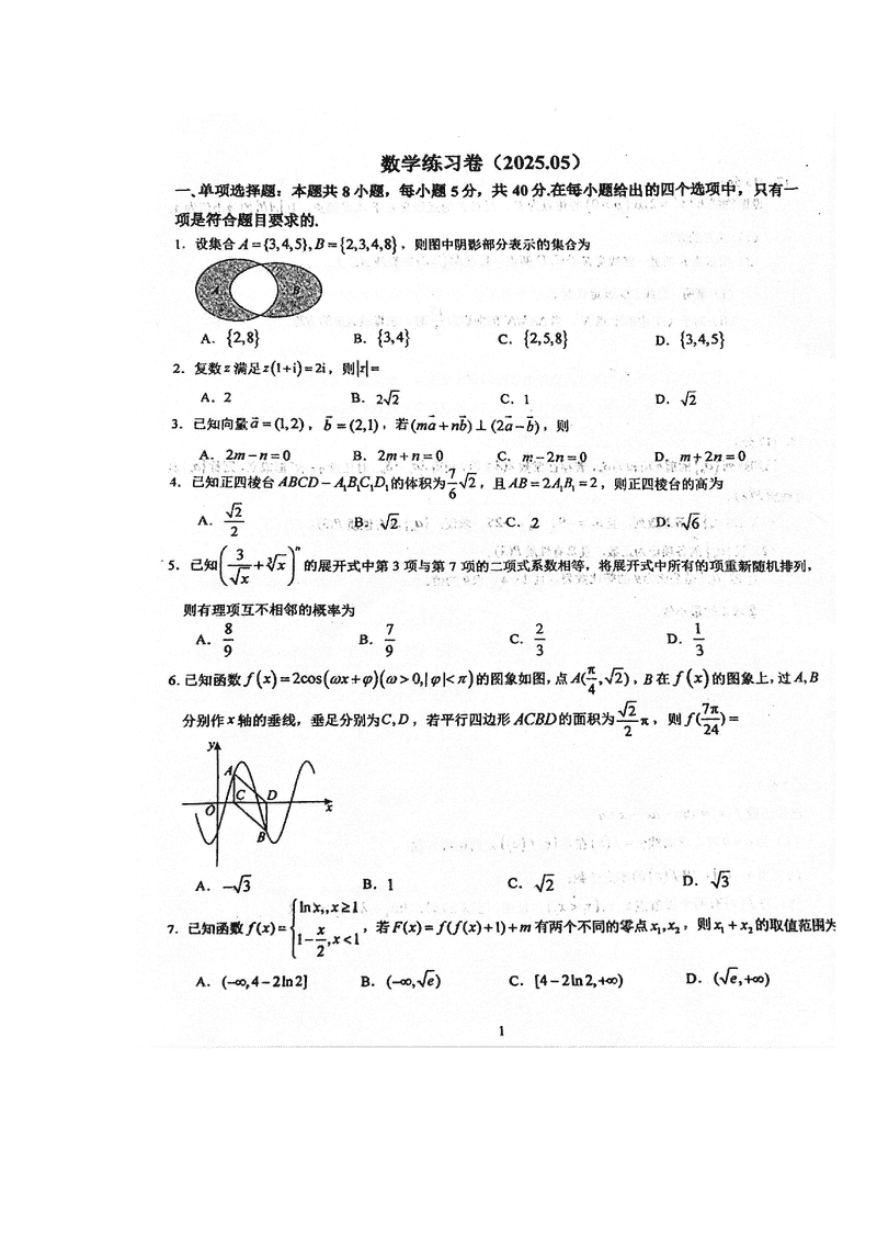 湖北华中师大一附中2025年高三五月限时训练数学试题及答案