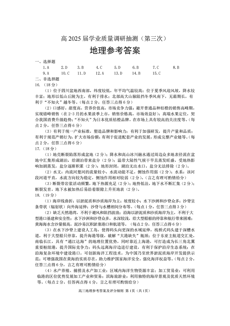 重庆市高2025届学业质量调研抽测(第三次)地理试题及答案