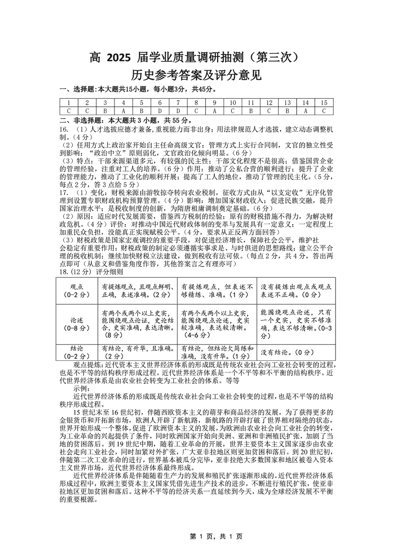 重庆市高2025届学业质量调研抽测(第三次)历史试题及答案