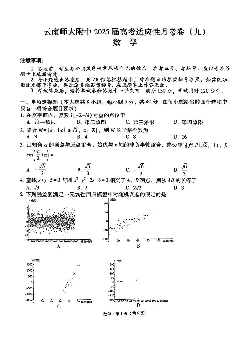云南师大附中2025届高考适应性月考卷九数学考试已于近日开考,为方便考生考后及时查看考试情况,查漏补缺、弥补不足,本文整理了试题答案解析相关信息!