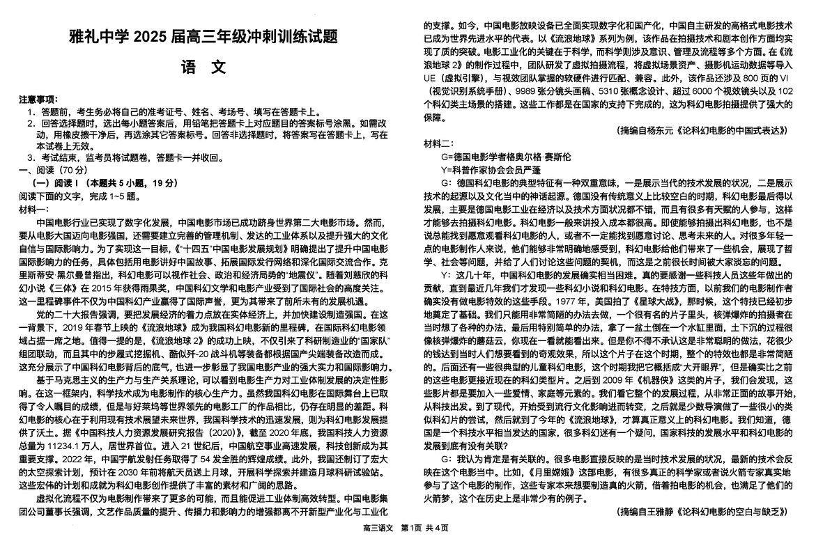 湖南雅礼中学2025届高三下学期冲刺训练语文试题及答案