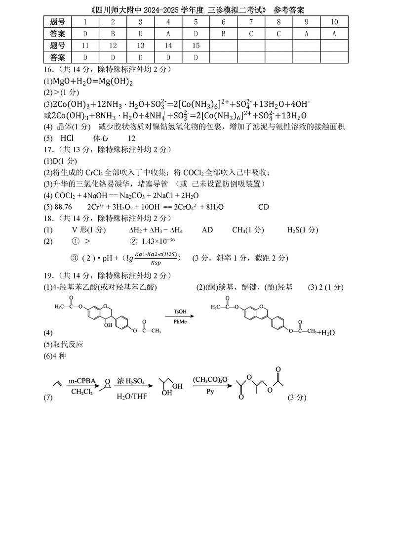 四川师大附中2025届高三下学期三诊模拟二化学考试已于近日开考,为方便考生考后及时查看考试情况,查漏补缺、弥补不足,本文整理了试题答案解析相关信息!