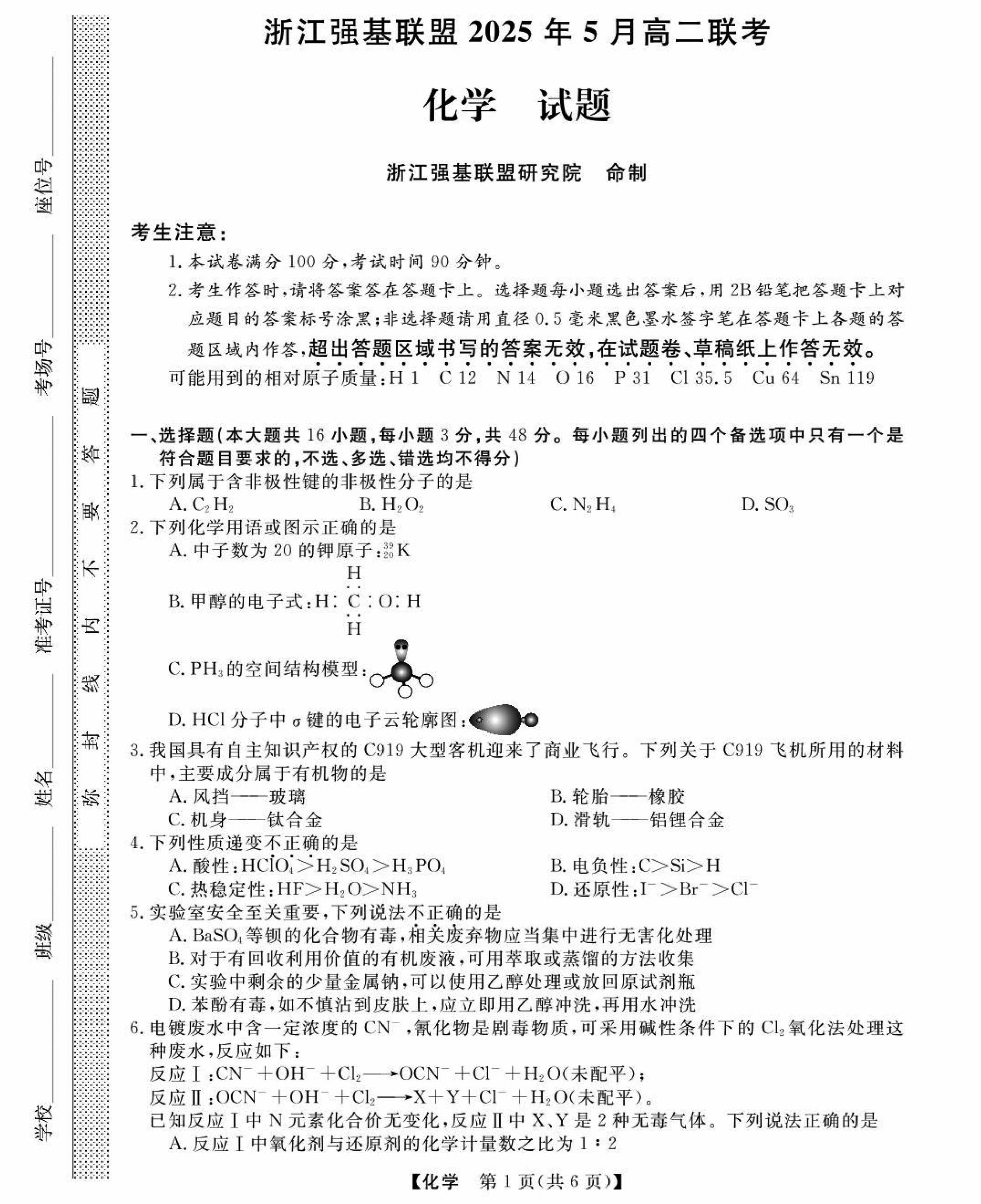 浙江强基联盟2024-2025学年高二下学期5月月考化学物理试题及答案