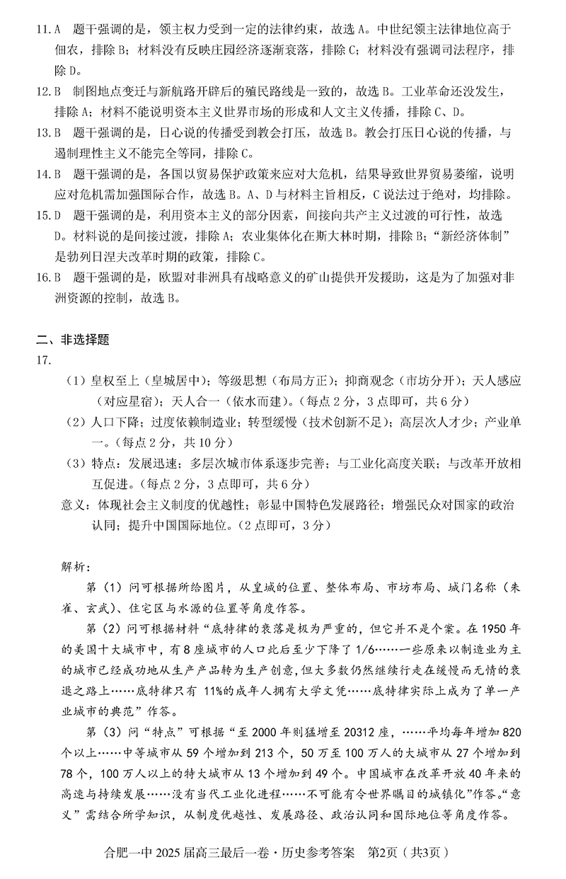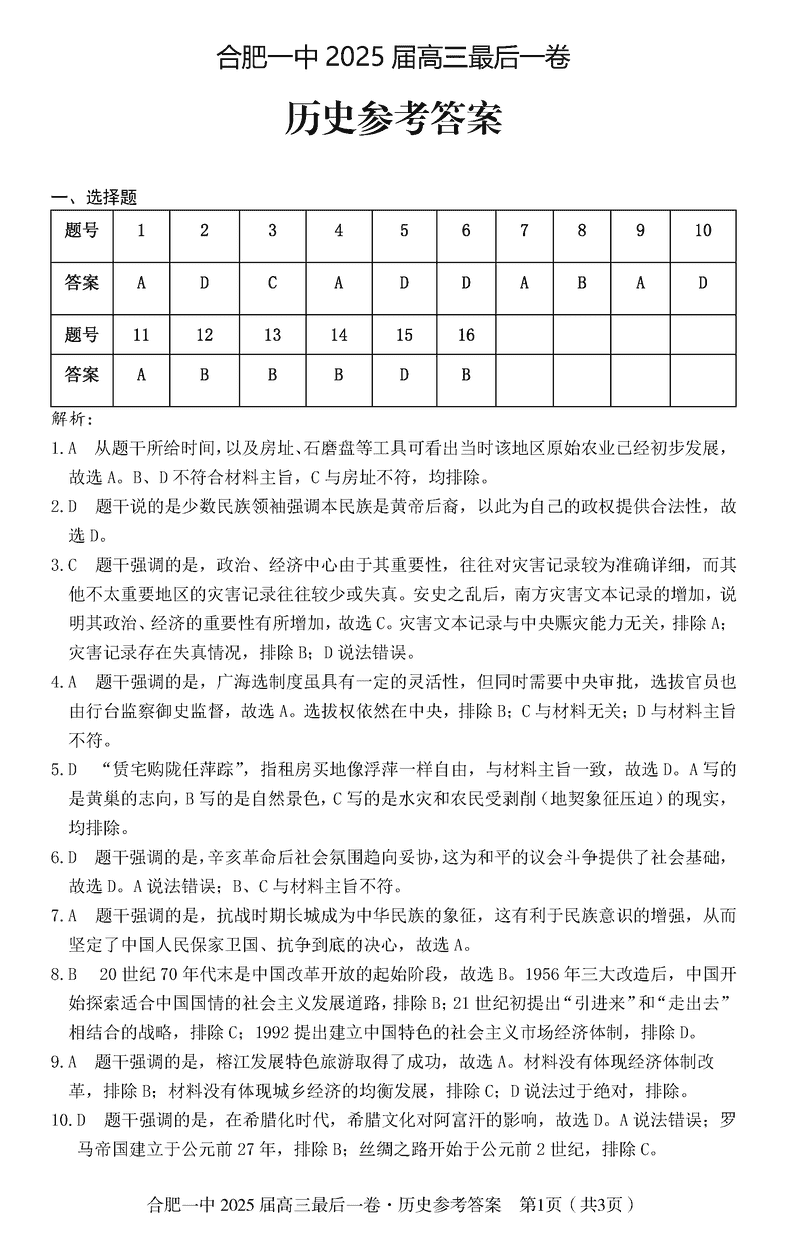 2025年合肥一中最后一卷历史试题及答案 时间:2025-05-26 安徽 文综试题 2025年合肥一中最后一卷历史考试已于近日开考,为方便考生考后及时查看考试情况,查漏补缺、弥补不足,本文整理了试题答案解析相关信息! 汇总:安徽省合肥一中2025届高三最后一卷试题及答案汇总 历史试题及答案解析