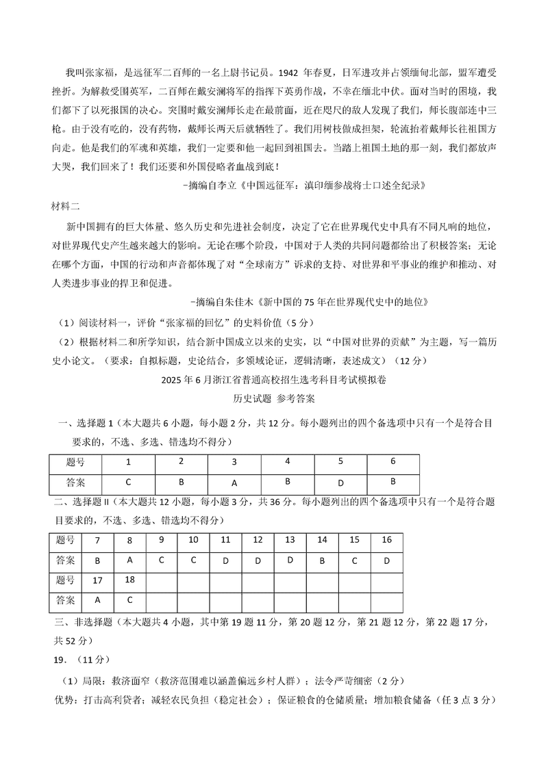 浙江六校联考2025届高三5月模拟历史试题及答案