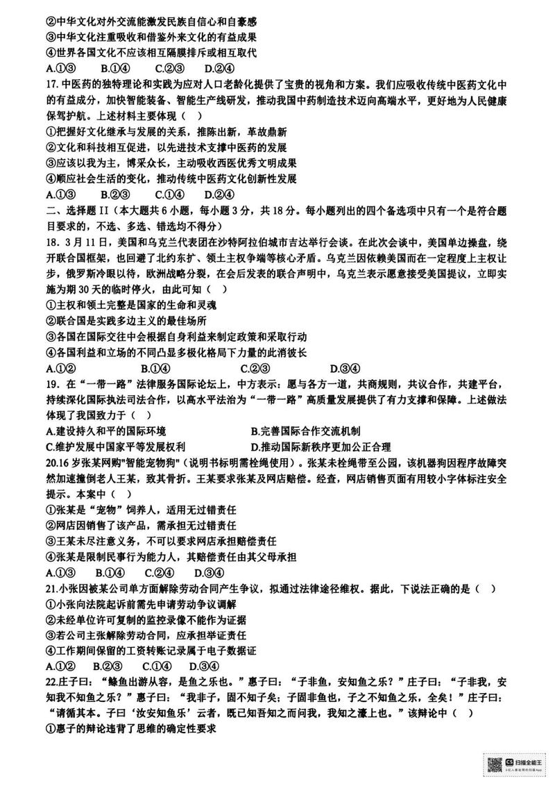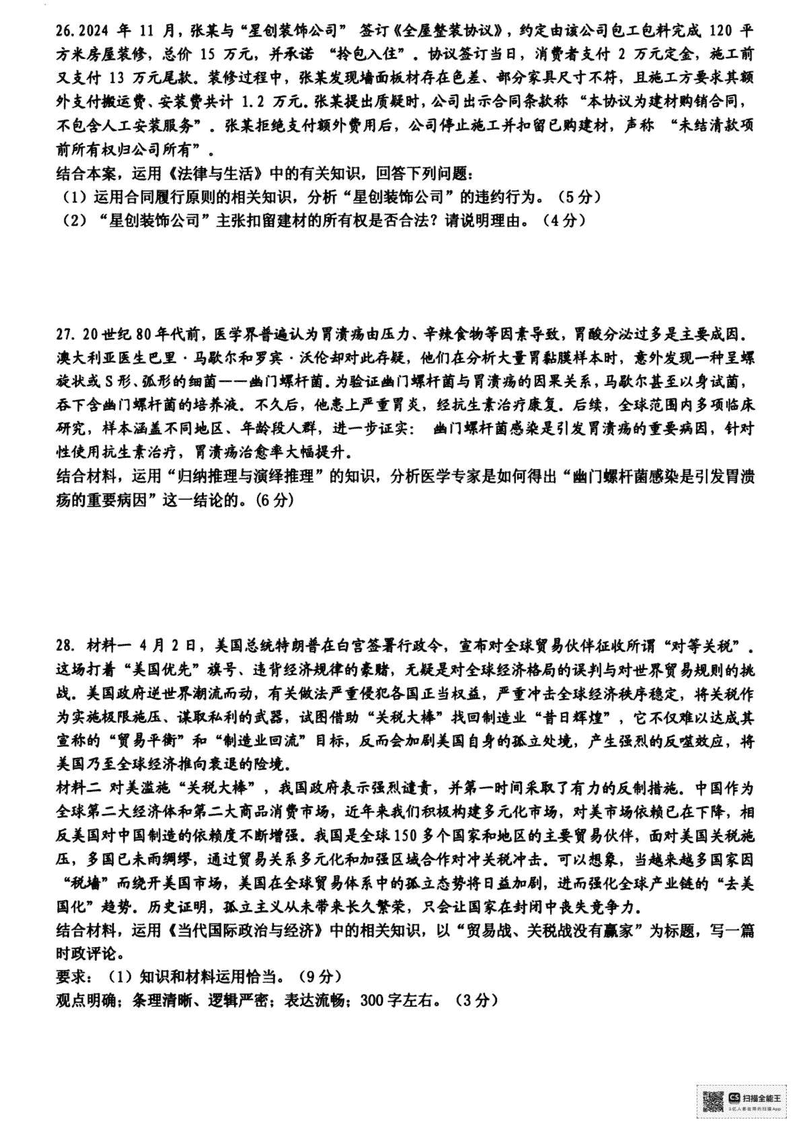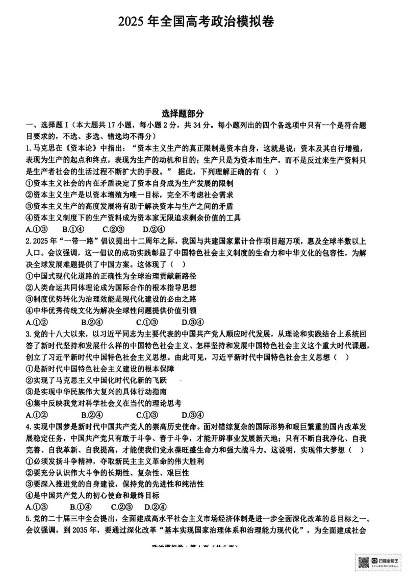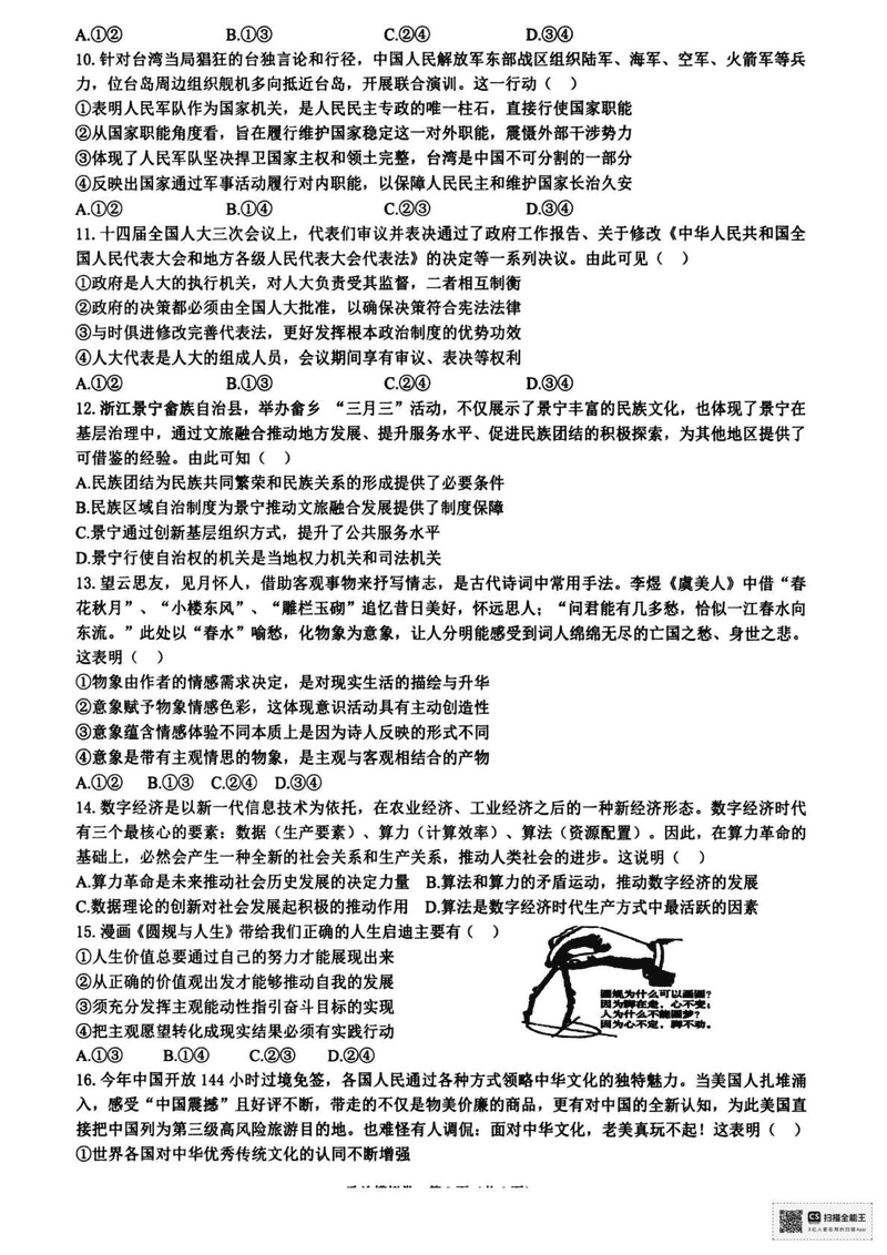 浙江六校联考2025届高三5月模拟政治试题及答案