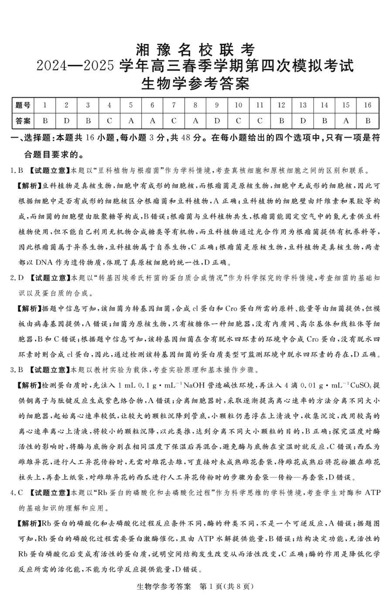 湘豫名校联考2024-2025学年高三下学期第四次模拟生物考试已于近日开考,为方便考生考后及时查看考试情况,查漏补缺、弥补不足,本文整理了试题答案解析相关信息!