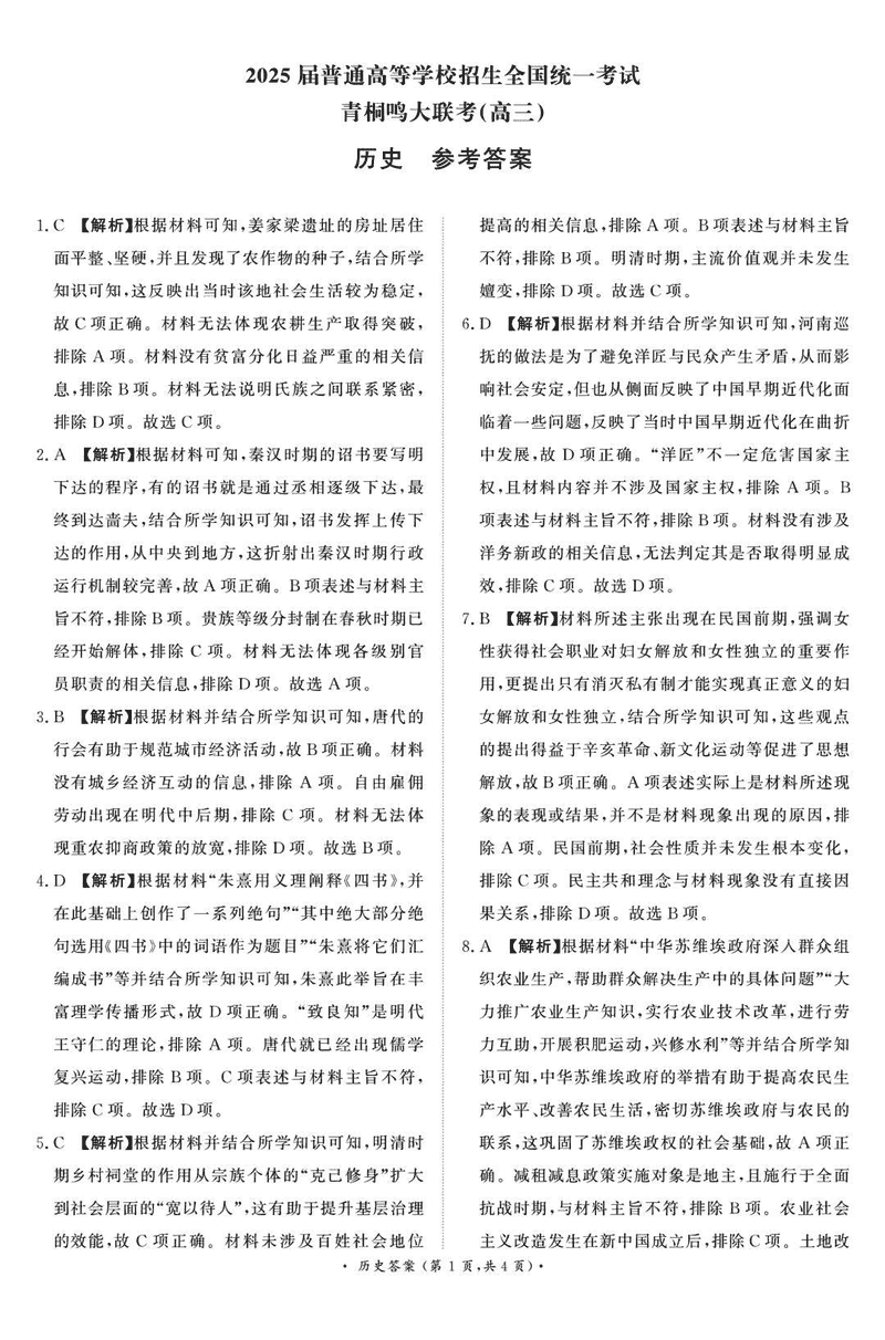 2025届河南青桐鸣5月全真模拟卷历史试题及答案 时间:2025-05-30 河南 文综试题 2025届河南省青桐鸣5月全真模拟卷历史考试已于近日开考,为方便考生考后及时查看考试情况,查漏补缺、弥补不足,本文整理了试题答案解析相关信息! 汇总:2025届河南省青桐鸣5月全真模拟卷试题及答案汇总 历史试题及答案解析