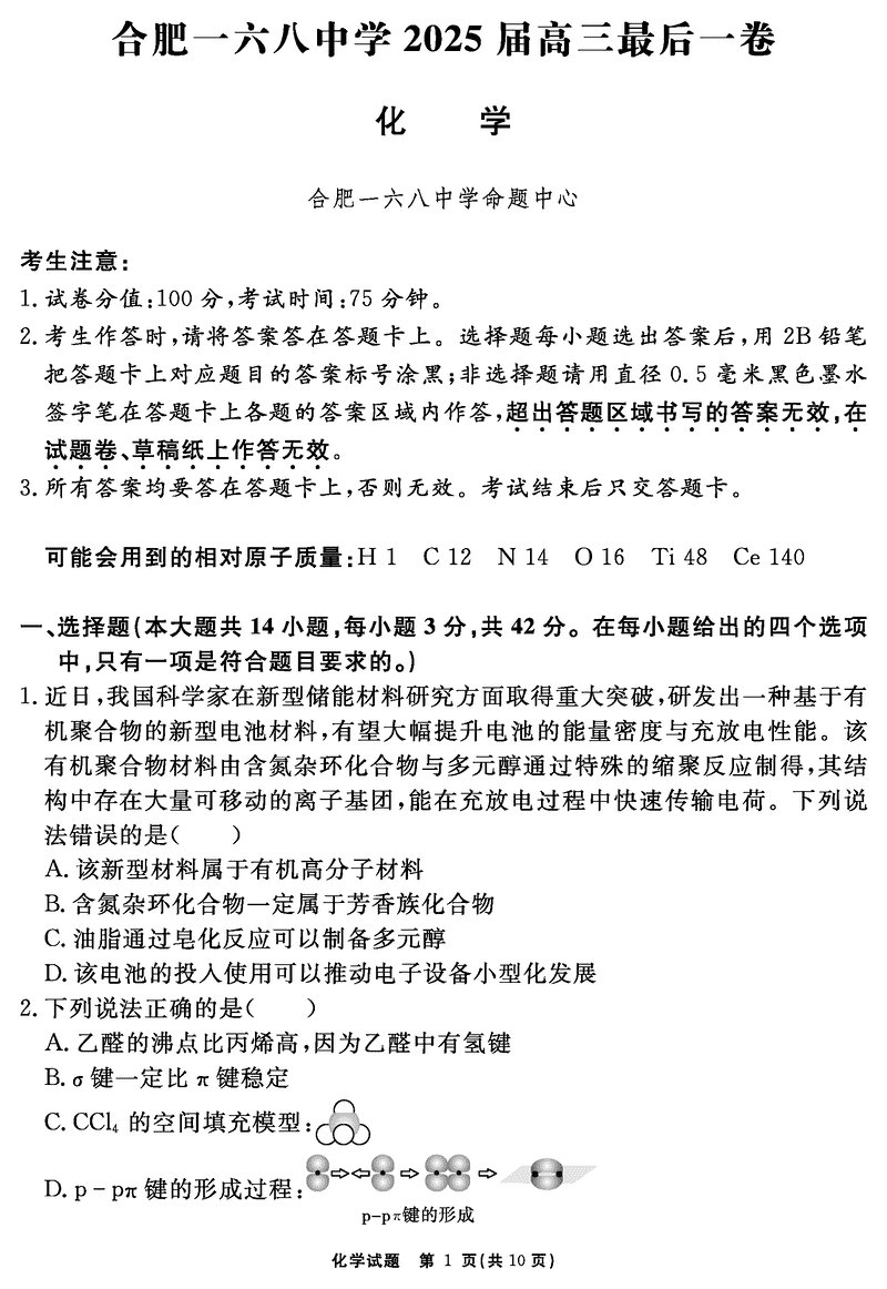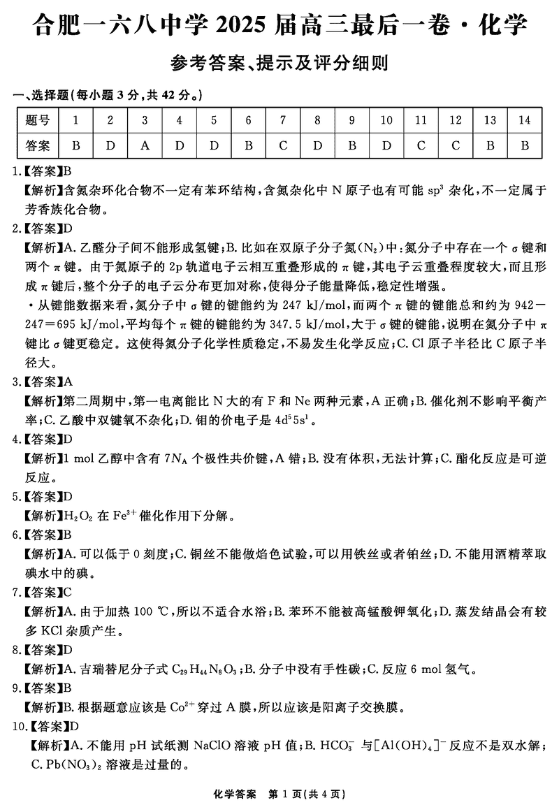 合肥一六八中学2025届高三最后一卷化学试题及答案 时间:2025-06-01 安徽 理综试题 合肥一六八中学2025届高三最后一卷化学考试已于近日开考,为方便考生考后及时查看考试情况,查漏补缺、弥补不足,本文整理了试题答案解析相关信息! 汇总:合肥一六八中学2025届高三最后一卷试题及答案汇总 化学试题及答案解析