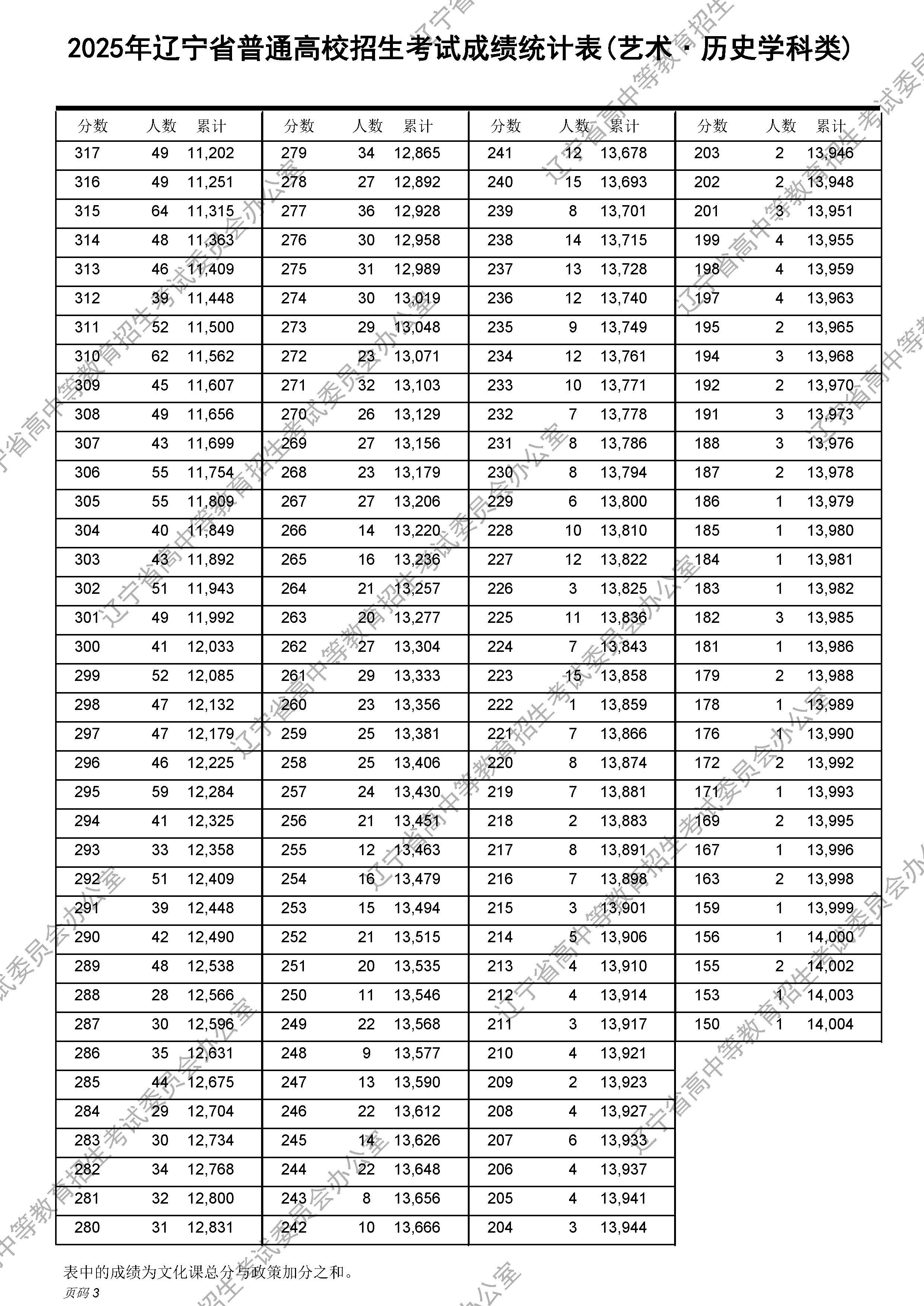 2025年辽宁高考艺术类成绩一分一段表及位次排名(历史学科类)