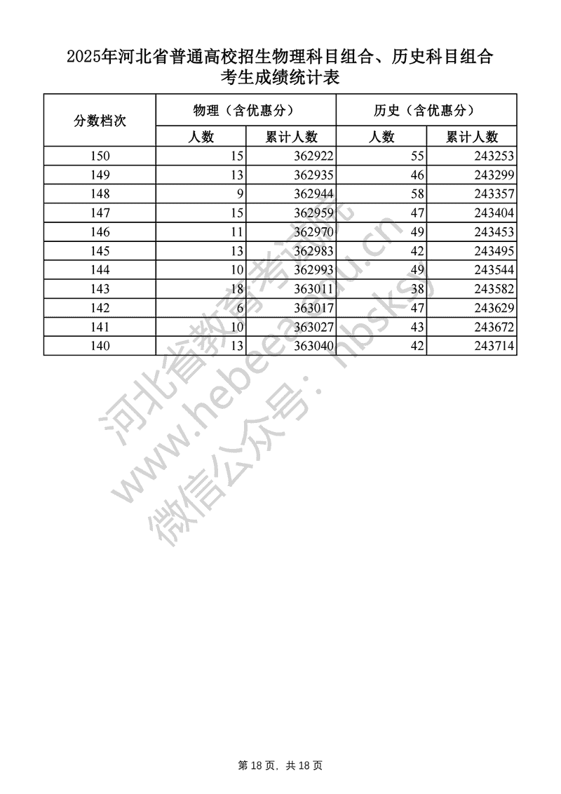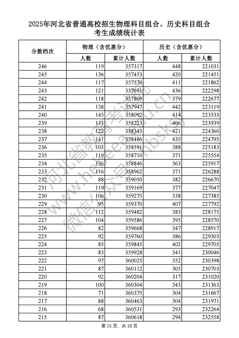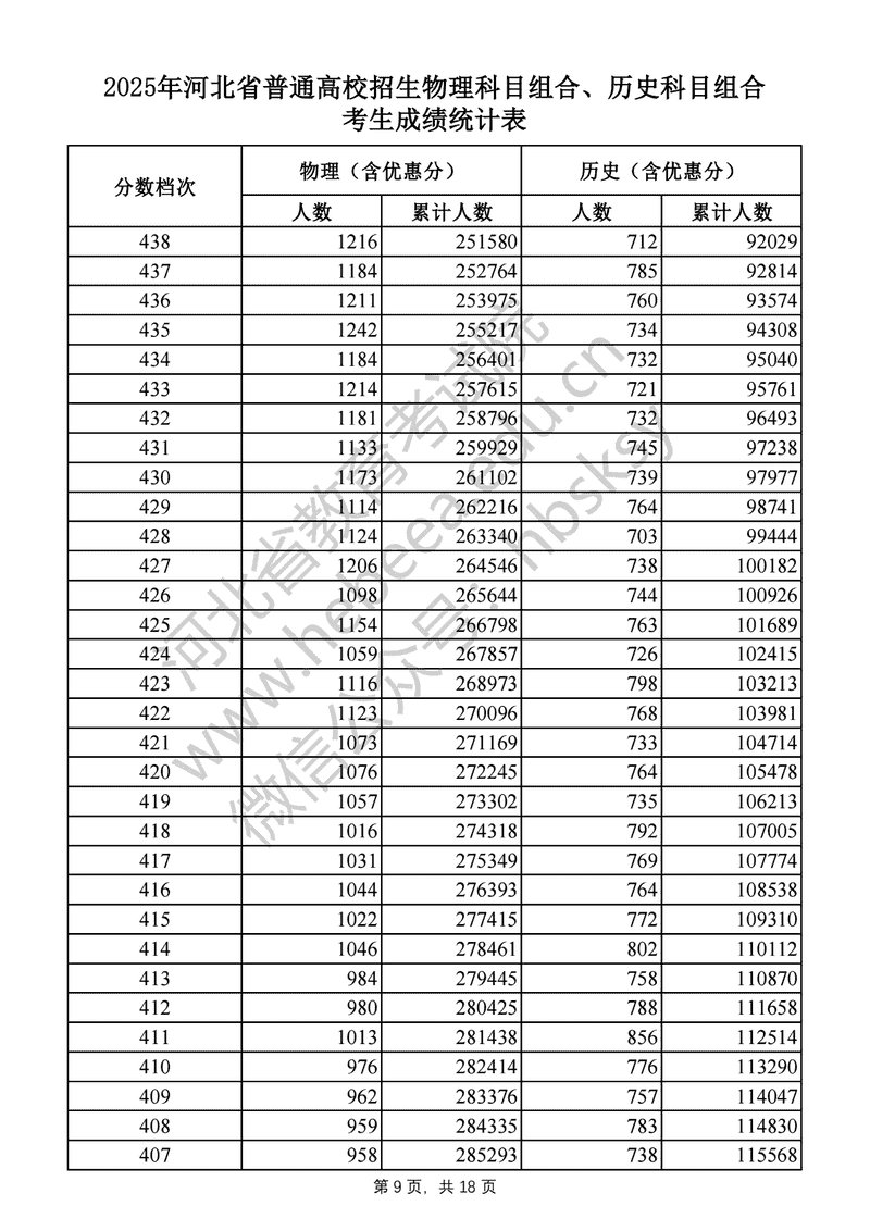 2025年河北高考物理科目组合、历史科目组合成绩一分一段表及位次排名