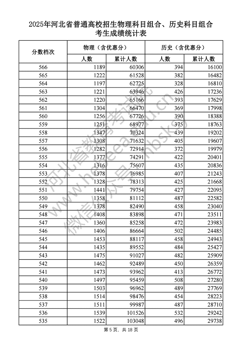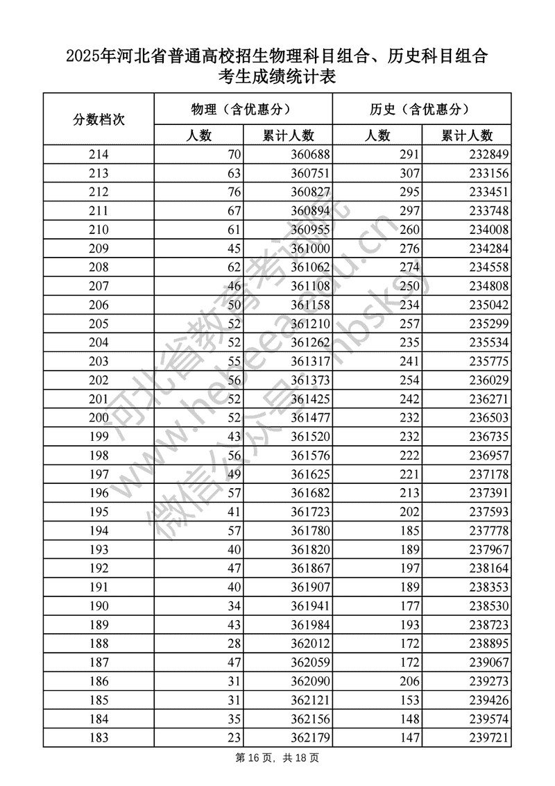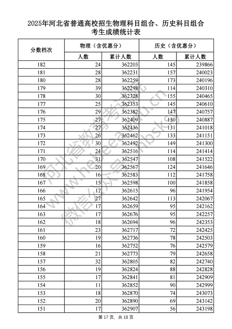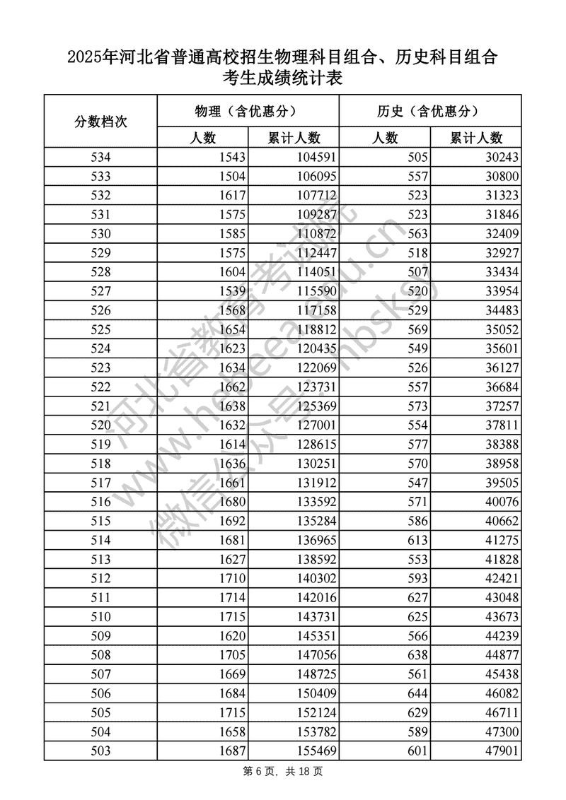 2025年河北高考物理科目组合、历史科目组合成绩一分一段表及位次排名