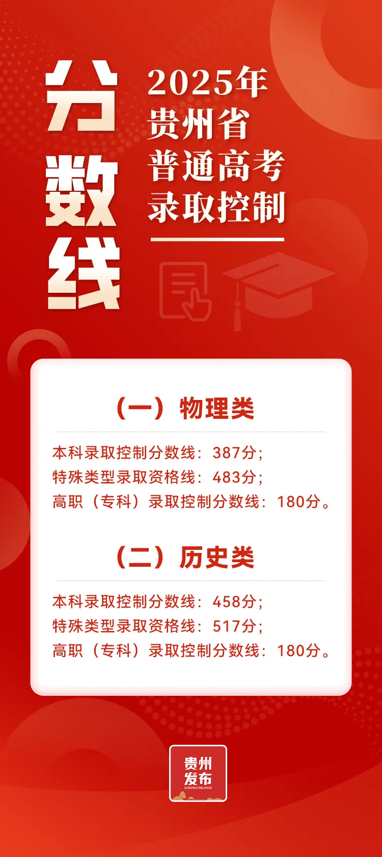 贵州2025年高考分数线公布:历史类本科线458、物理类本科线387