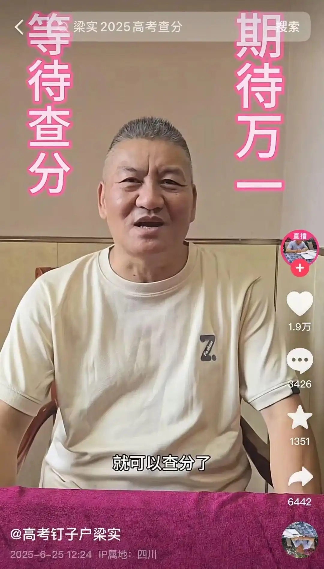 6月25日,第29次参加高考的梁实@梁三百300 发视频称,今天下午6点左右就可以查分了,有点坐立不安。梁实称,一觉醒来恐慌感就来了,“等待惊喜和意外出现”。