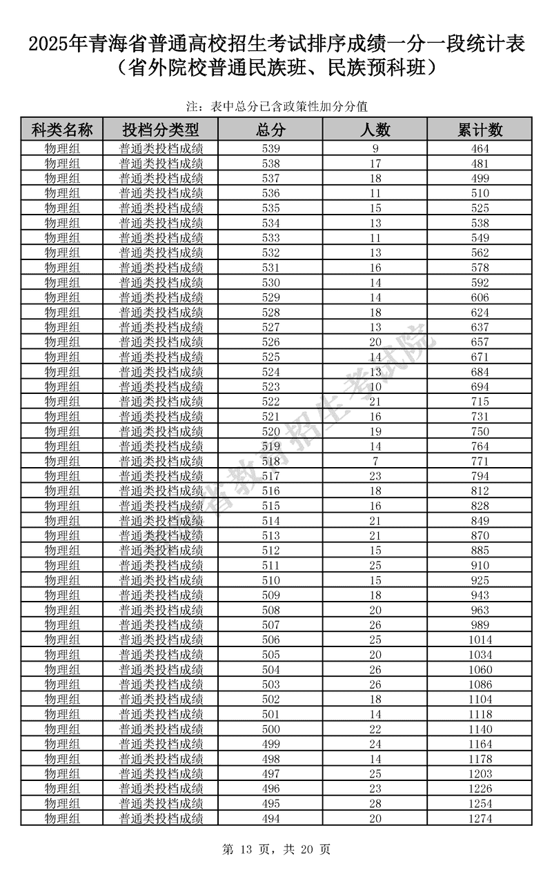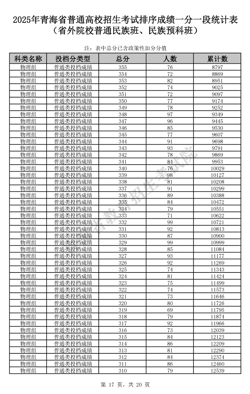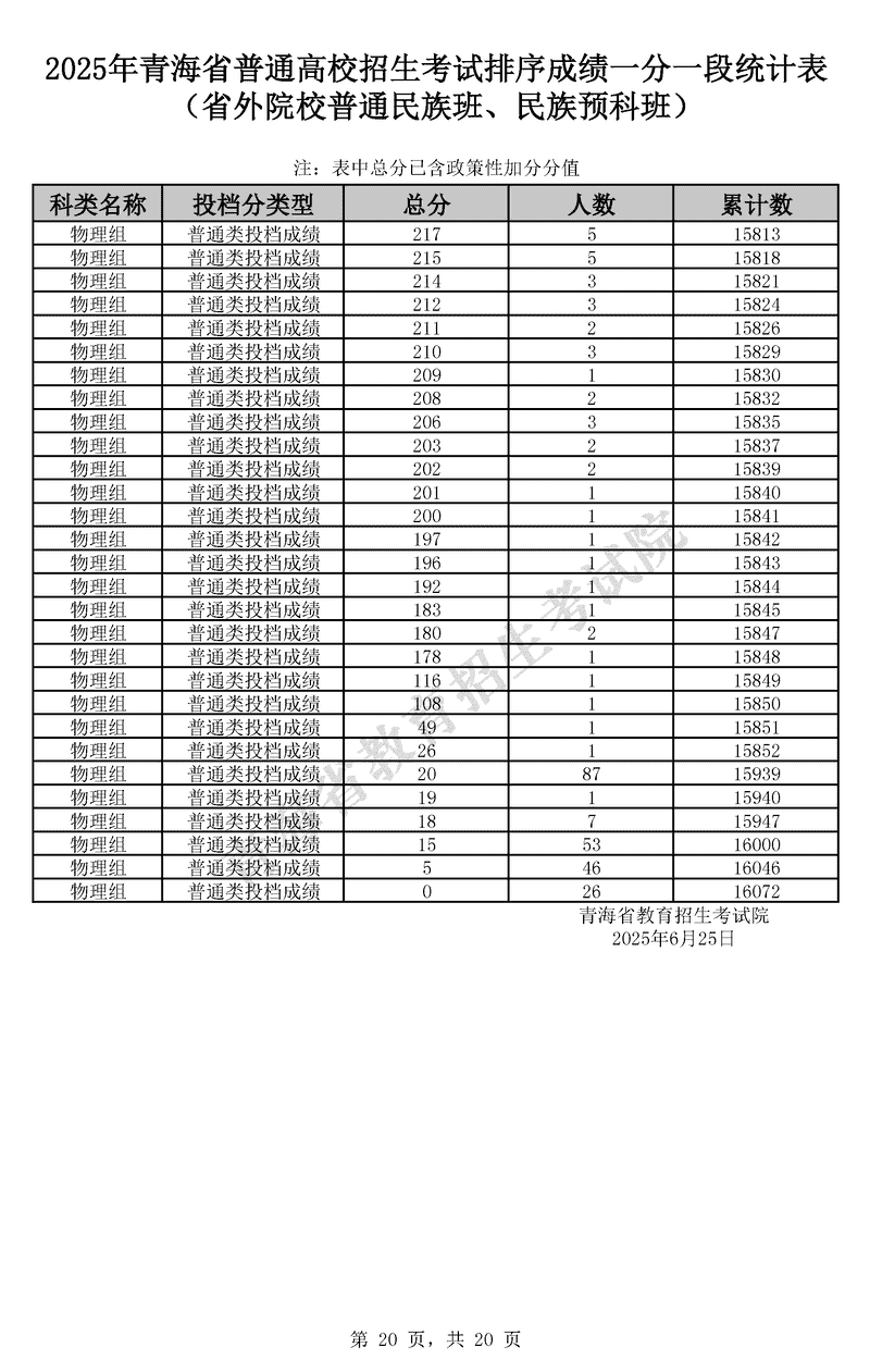 2025年青海高考排序成绩一分一段统计表(省外院校普通民族班、民族预科班) 时间:2025-06-26 青海 成绩查询 2025年青海省普通高校招生考试排序成绩一分一段统计表 (省外院校普通民族班、民族预科班)