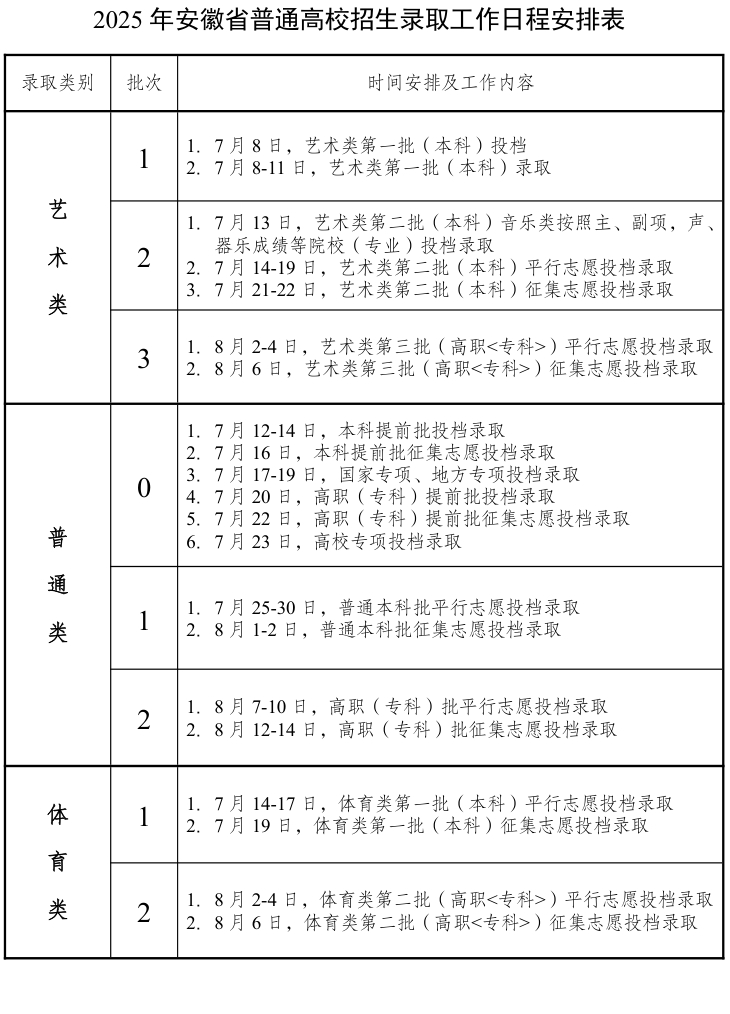 安徽高考2025年各批次录取时间公布,不同批次录取时间安排如下: