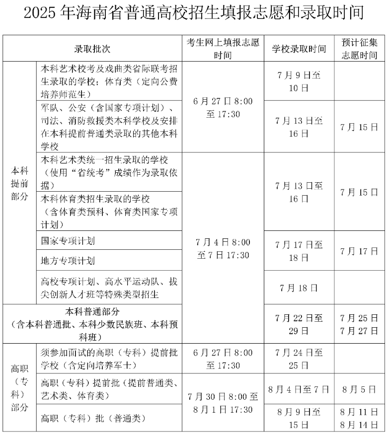 2025海南高考各批次志愿录取时间公布: