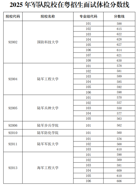 2025年军队院校在广东招生面试体检分数线