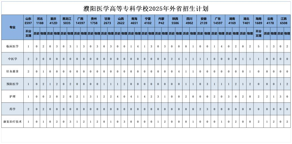 本文为大家整理的是濮阳医学高等专科学校2025年招生计划,主要包含招生专业、招生类别、各专业招生人数等信息,希望对大家有所帮助,如有变动或异议,请以各省市教育考试院或学校公布的信息为准。