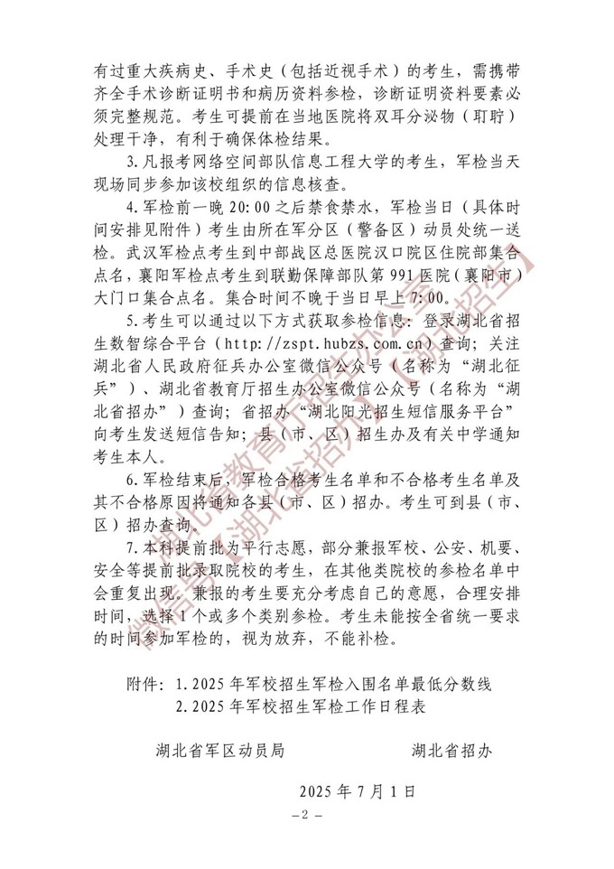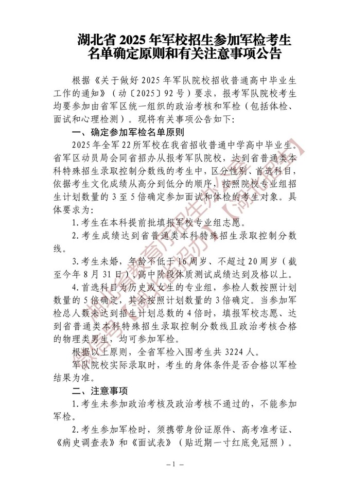 湖北:2025年军校招生参加军检考生名单确定原则和有关注意事项公告