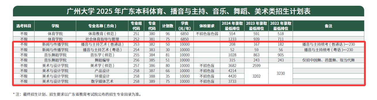 本文为大家整理的是广州大学2025年艺术类招生计划,主要包含招生专业、各专业招生人数等信息,希望对大家有所帮助,如有变动或异议,请以各省市教育考试院或学校公布的信息为准。