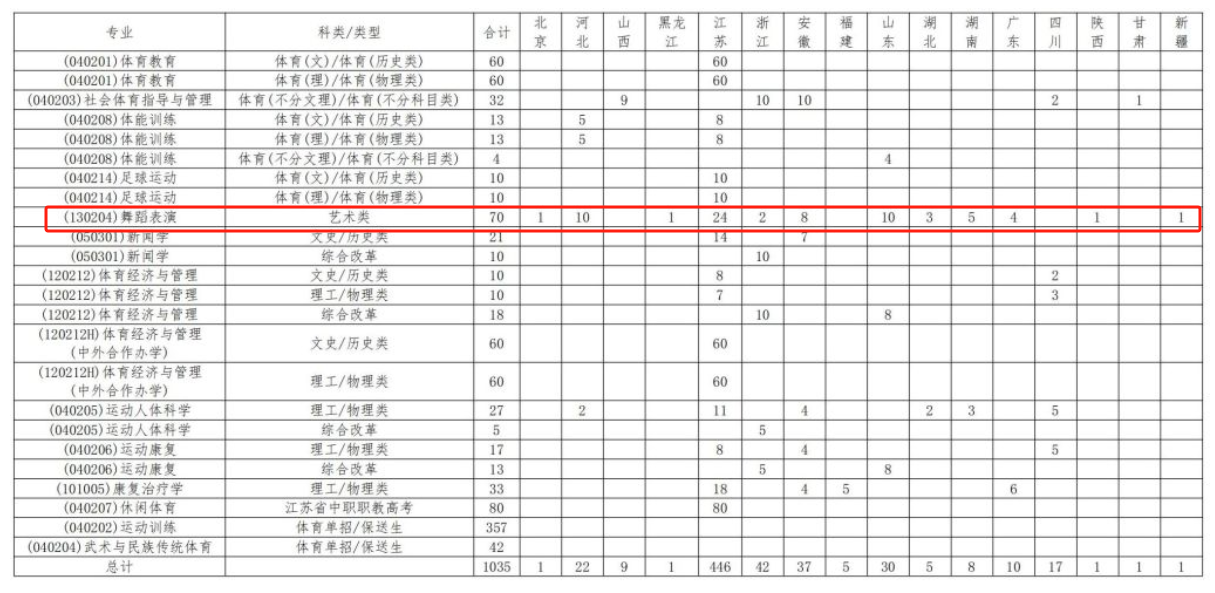 南京体育学院艺术类招生计划