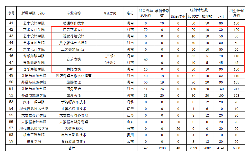 河南工业贸易职业学院2025年高职高专分省分院分专业招生计划表-艺术类