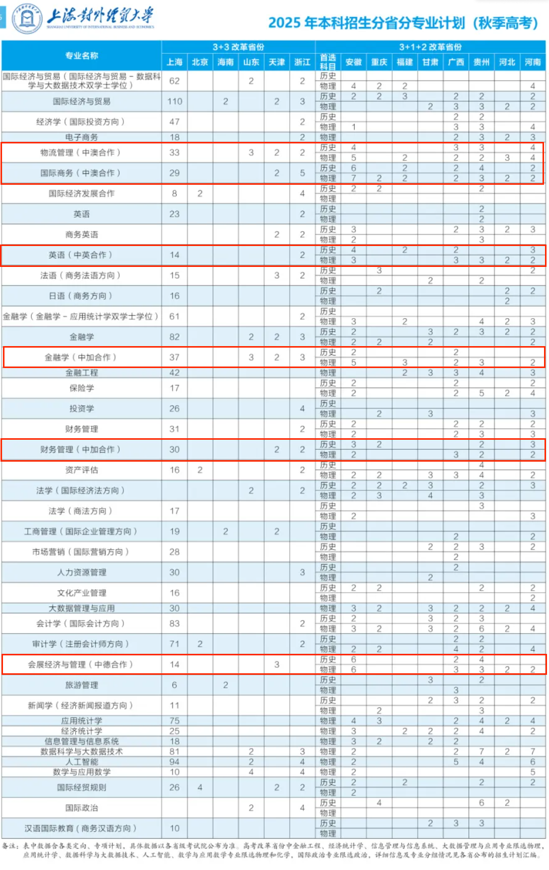 2025上海对外经贸大学中外合作办学招生计划及各专业招生人数