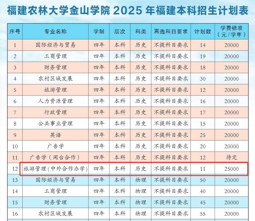 本文为大家整理的是福建农林大学金山学院2025年中外合作办学招生计划,主要包含招生专业、各专业招生人数等信息,希望对大家有所帮助,如有变动或异议,请以各省教育考试院和学校公布的信息为准。