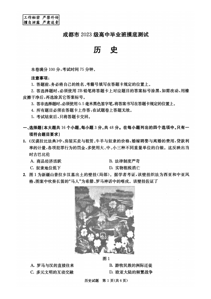 成都零诊2023级高中毕业班摸底测试历史试题及答案 时间:2025-07-08 四川 高中历史 四川省成都市2023级高中毕业班摸底测试(成都零诊)历史考试已于近日开考,为方便考生考后及时查看考试情况,查漏补缺、弥补不足,本文整理了试题答案解析相关信息! 历史试题及答案解析