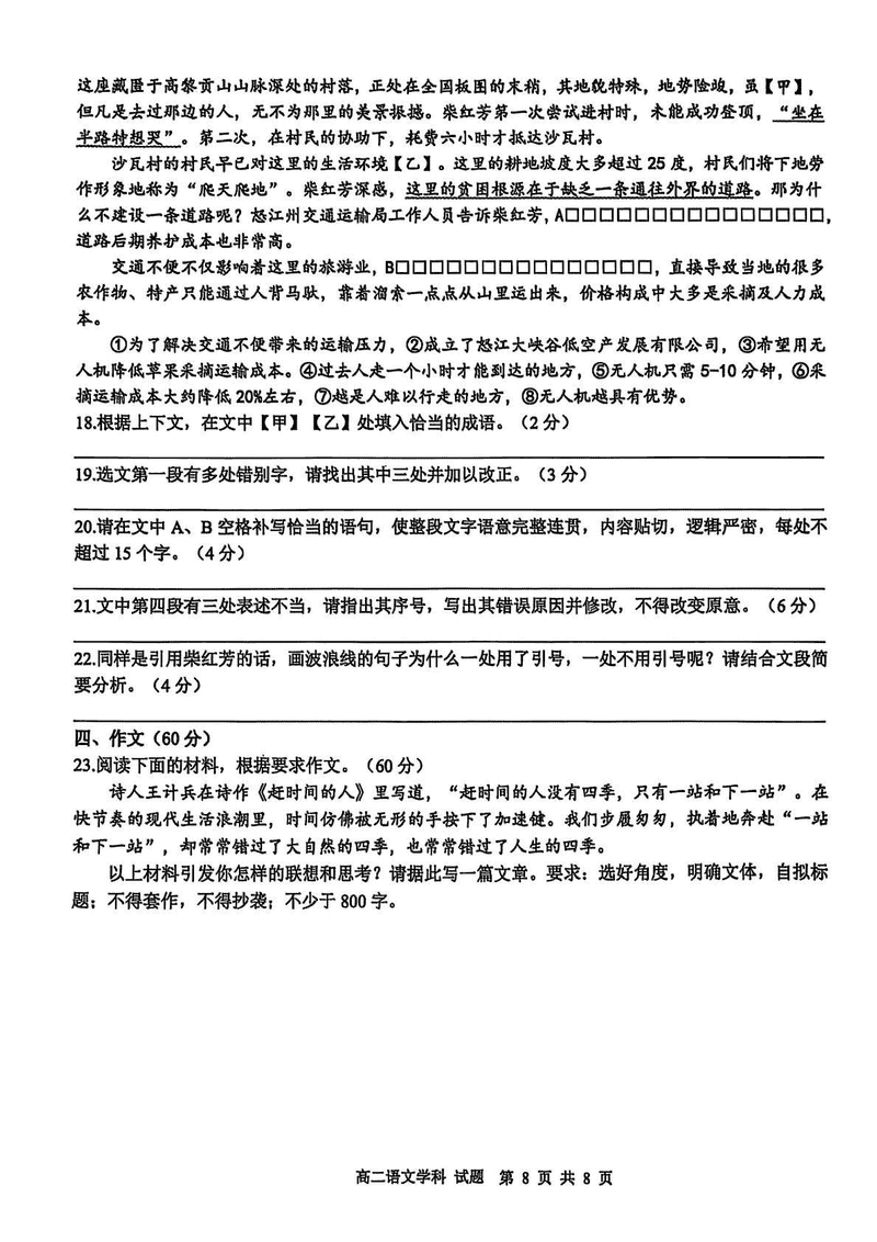 浙江浙南名校2024-2025学年高二下学期6月期末语文试题及答案 时间:2025-07-10 浙江 高中语文 浙江省温州市浙南名校2024-2025学年高二下学期6月期末语文考试已于近日开考,为方便考生考后及时查看考试情况,查漏补缺、弥补不足,本文整理了试题答案解析相关信息! 语文试题及答案解析