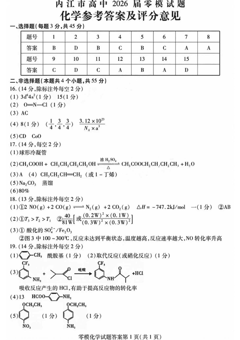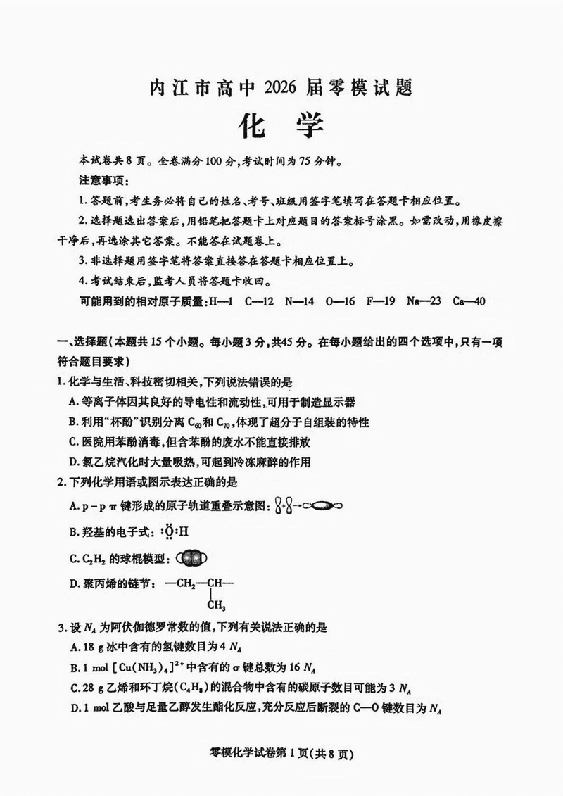 内江市2026届高三上学期零模化学试题及答案 时间:2025-07-13 四川 英语试题 四川内江市2026届高三上学期学期零模(高二下学期期末)化学考试已于近日开考,为方便考生考后及时查看考试情况,查漏补缺、弥补不足,本文整理了试题答案解析相关信息! 汇总:内江市2026届高三上学期学期零模试题及答案汇总 化学试题及答案解析