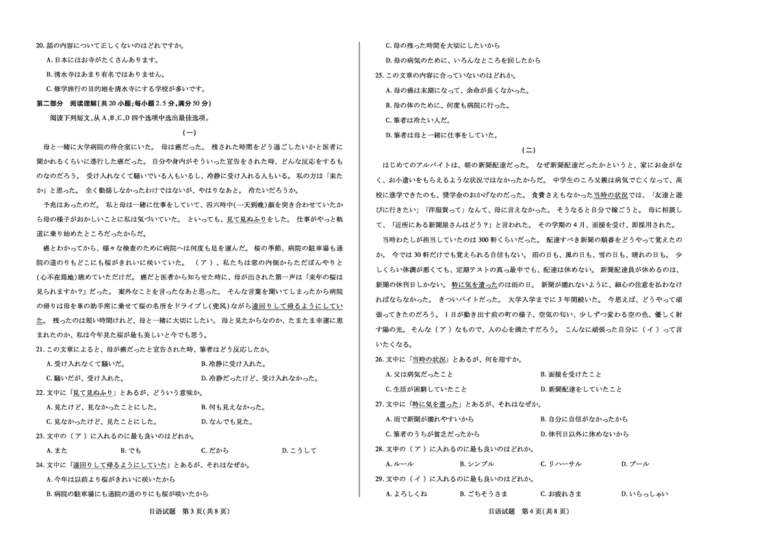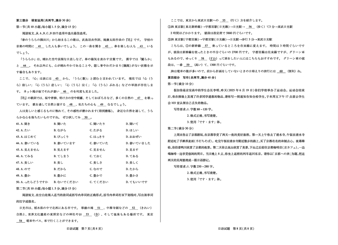 天一大联考·河南省2024-2025高二下学期期末日语试题及答案