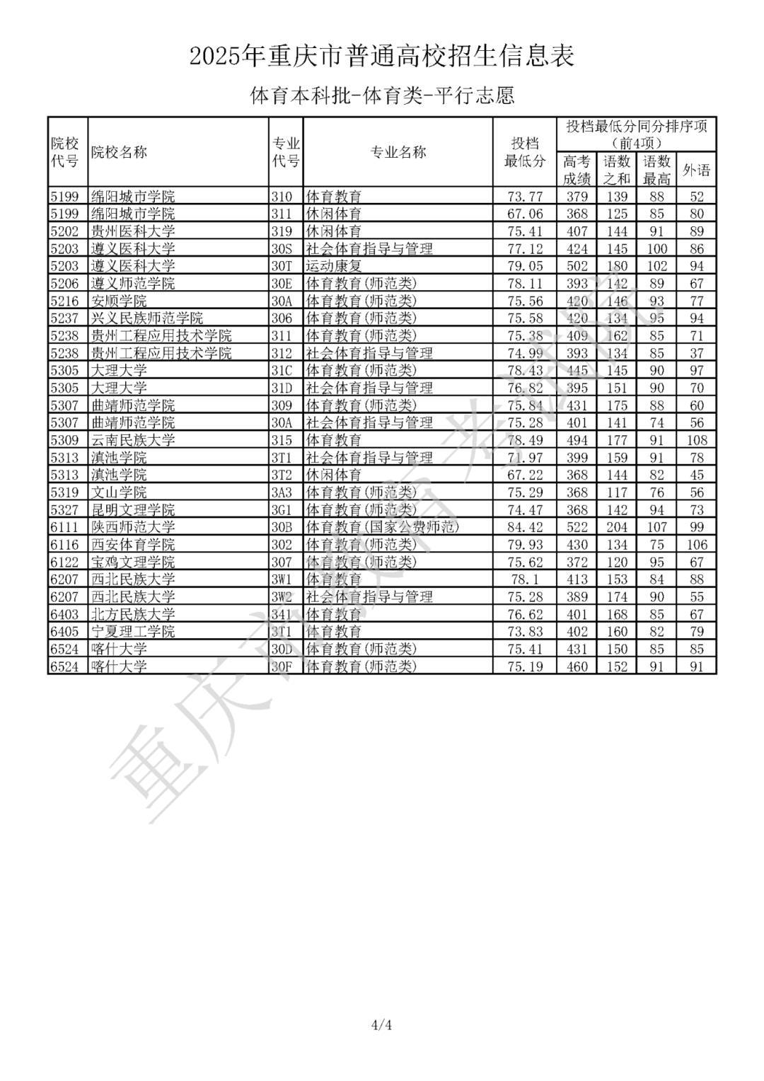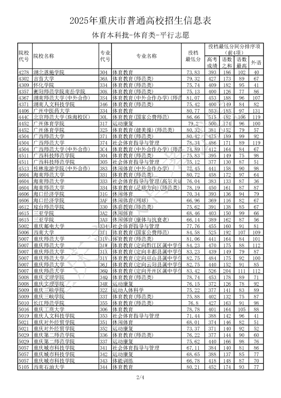 2025年重庆市普通高校招生信息表体育本科批-体育类-平行志愿信息已发布,具体内容如下: