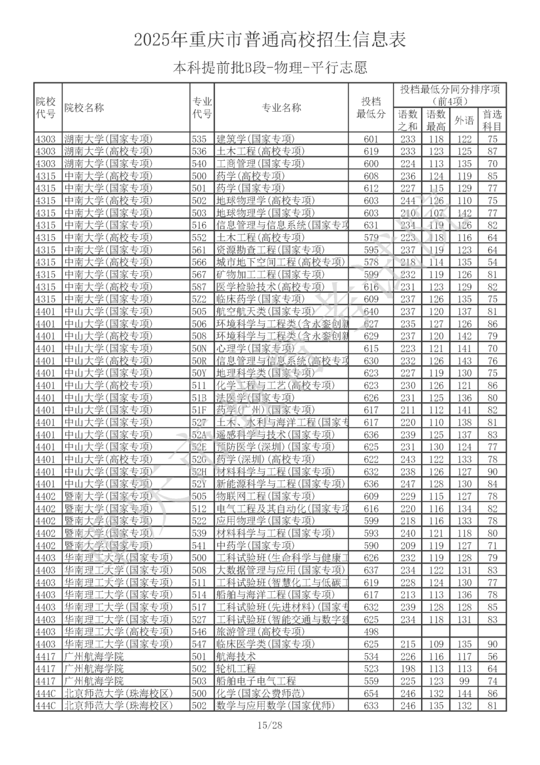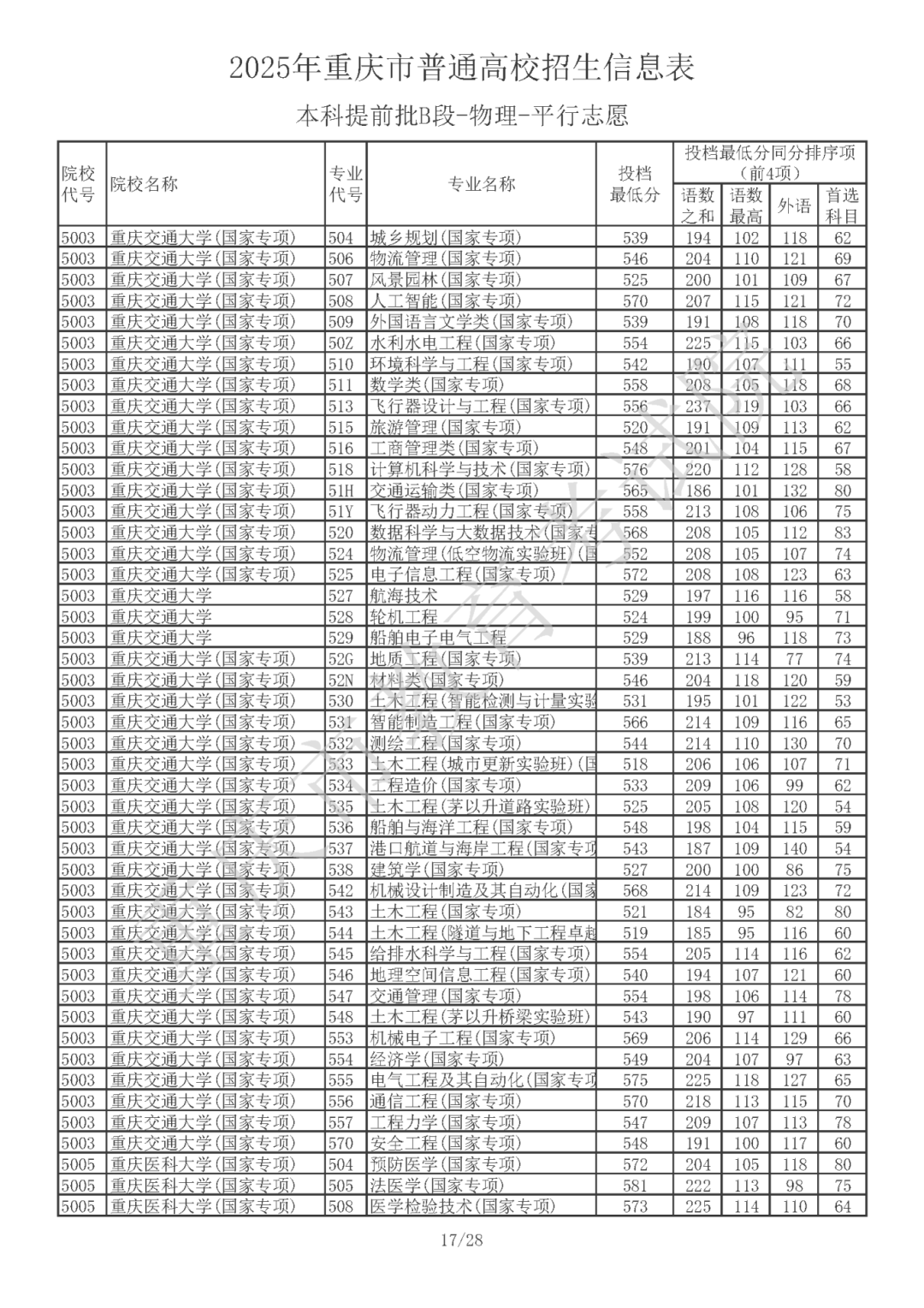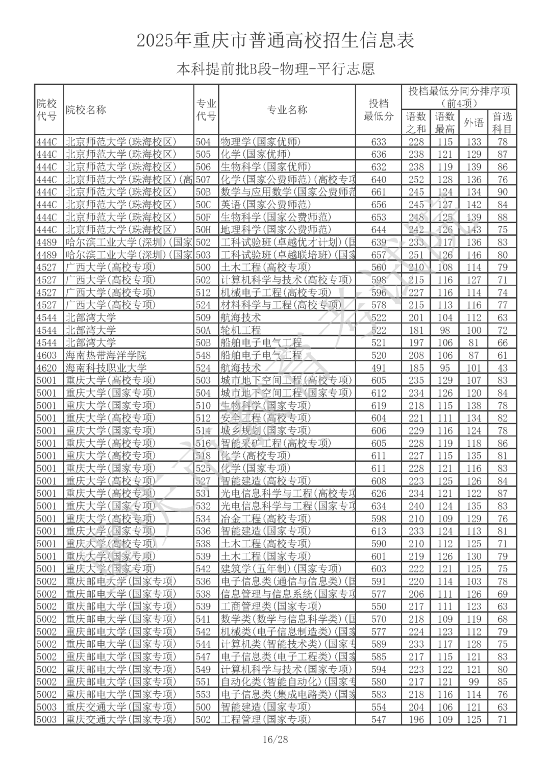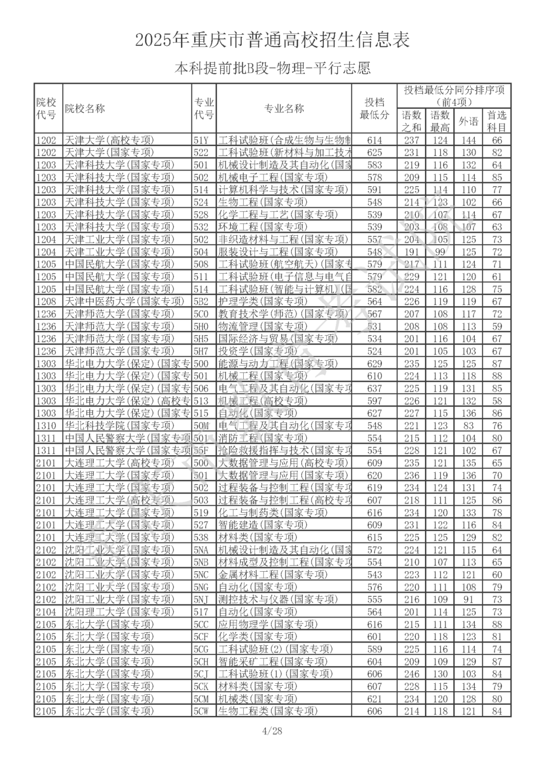 2025年重庆市普通高校招生信息表 普通类本科提前批B段(物理类)信息已发布,具体内容如下: