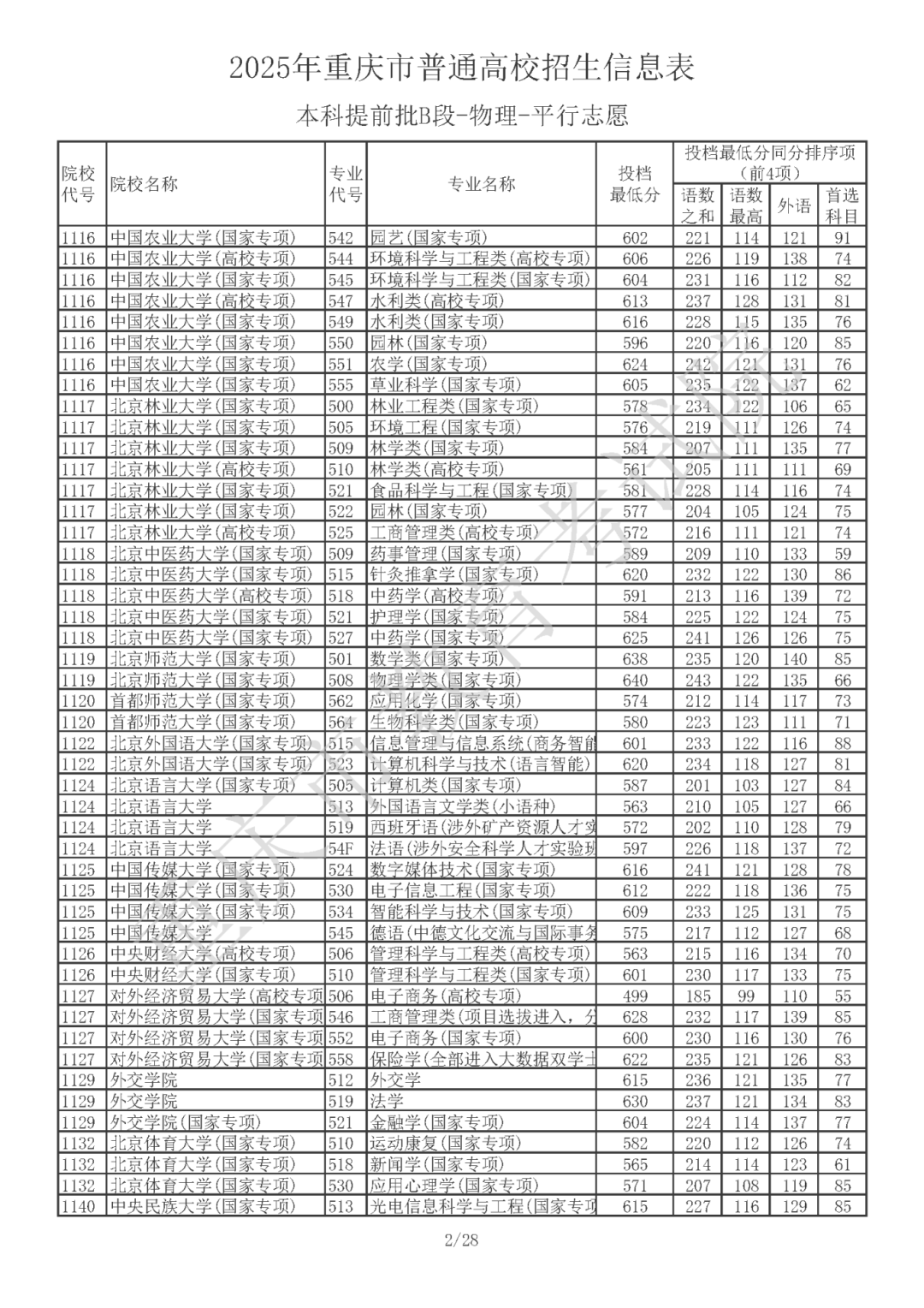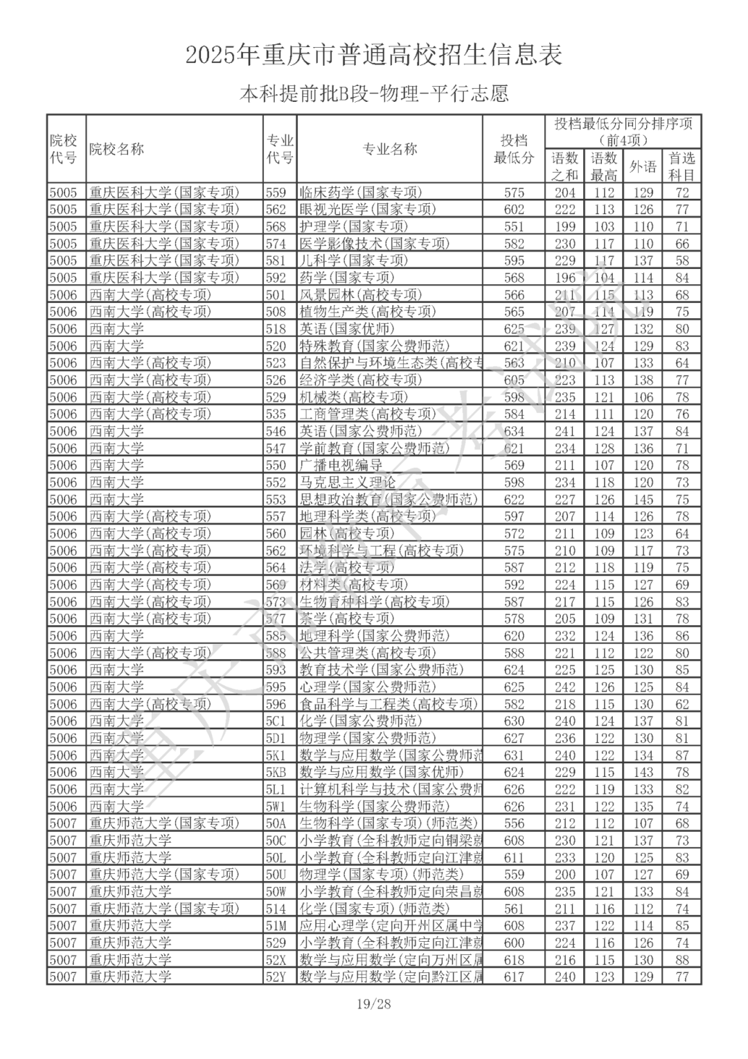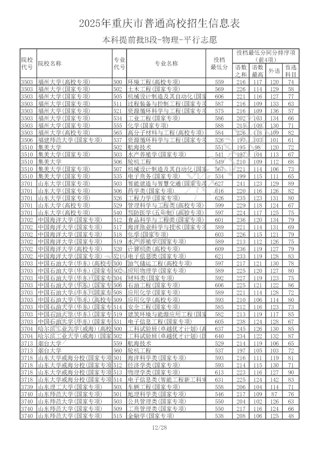 2025年重庆市普通高校招生信息表 普通类本科提前批B段(物理类)信息已发布,具体内容如下:
