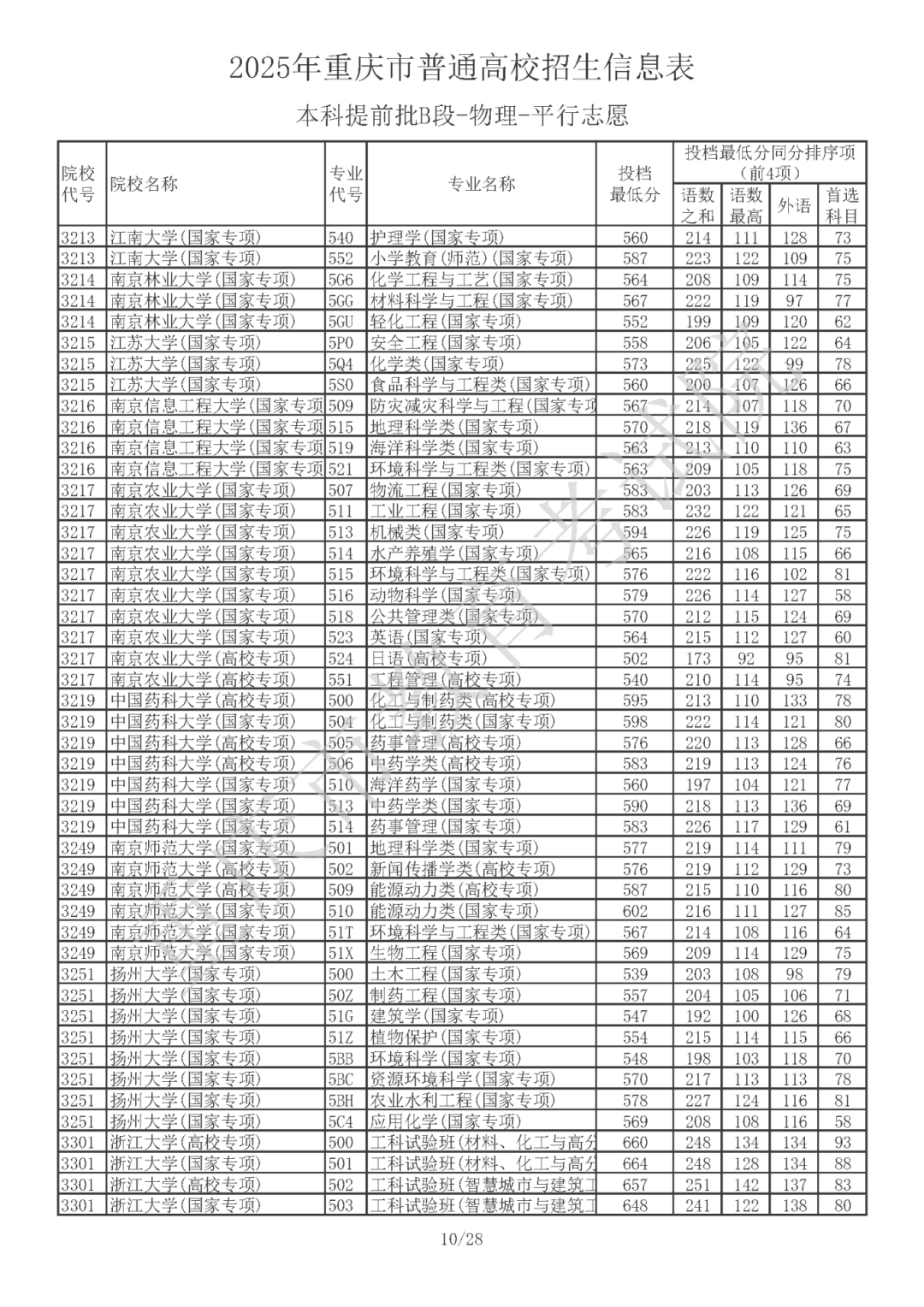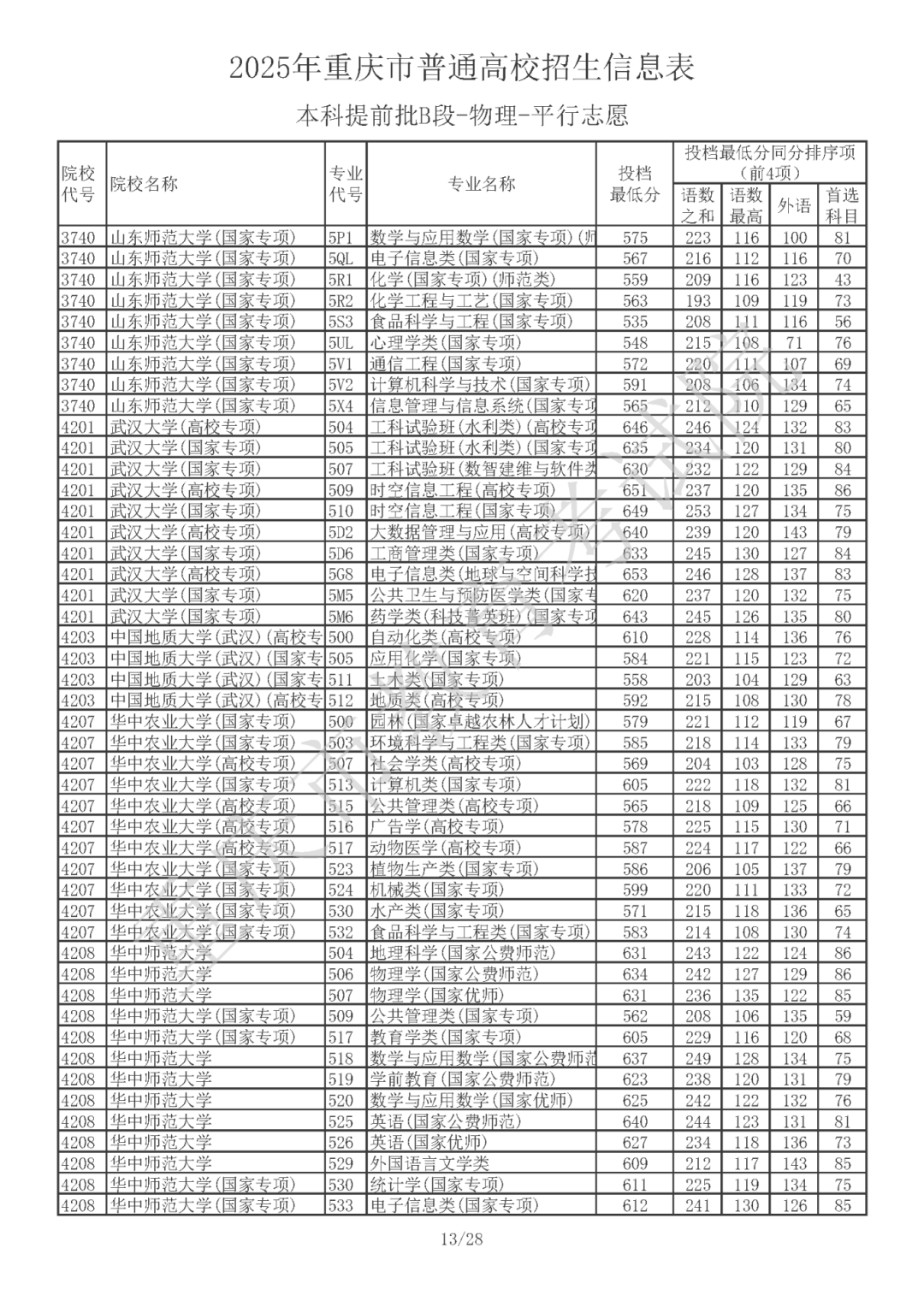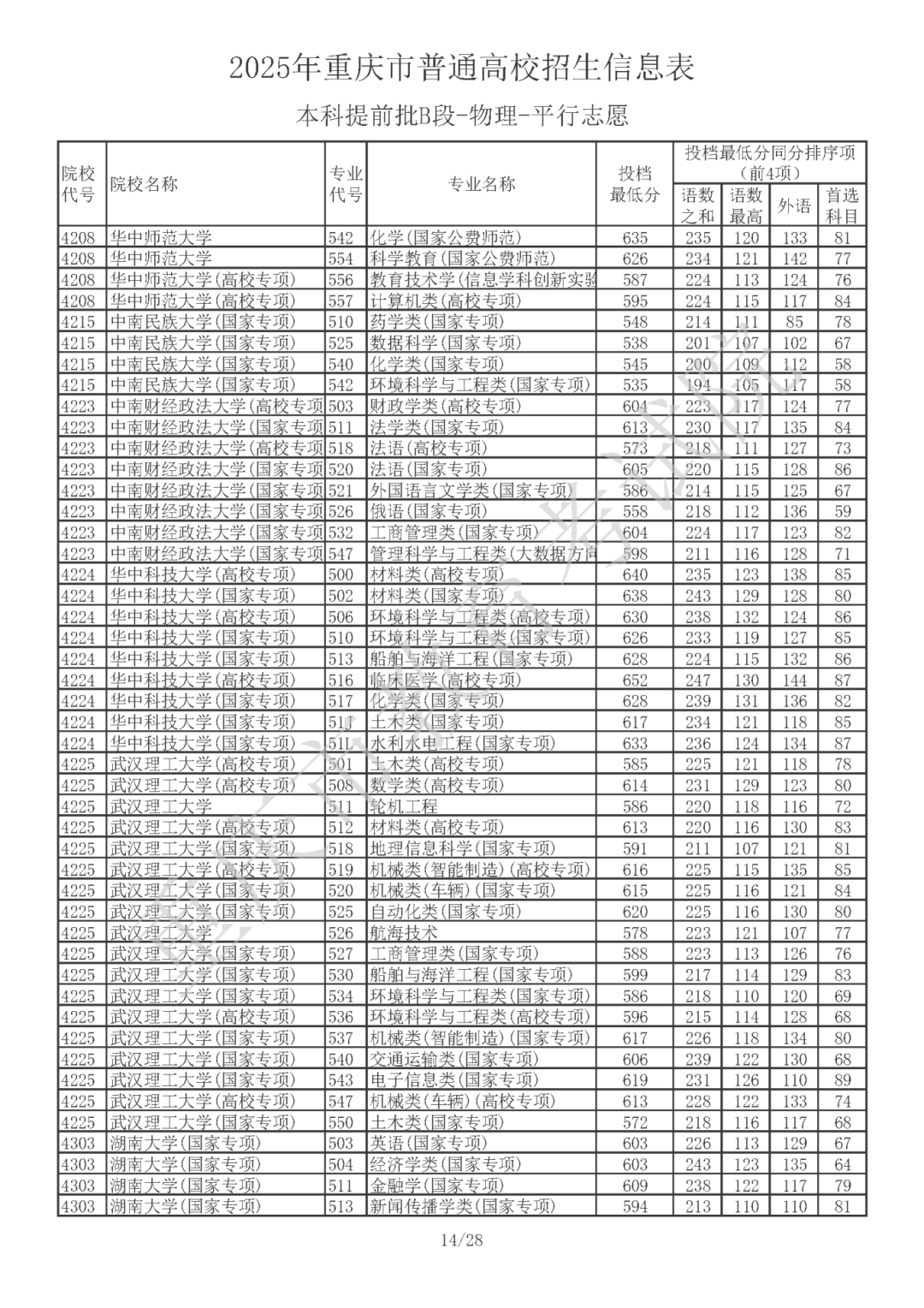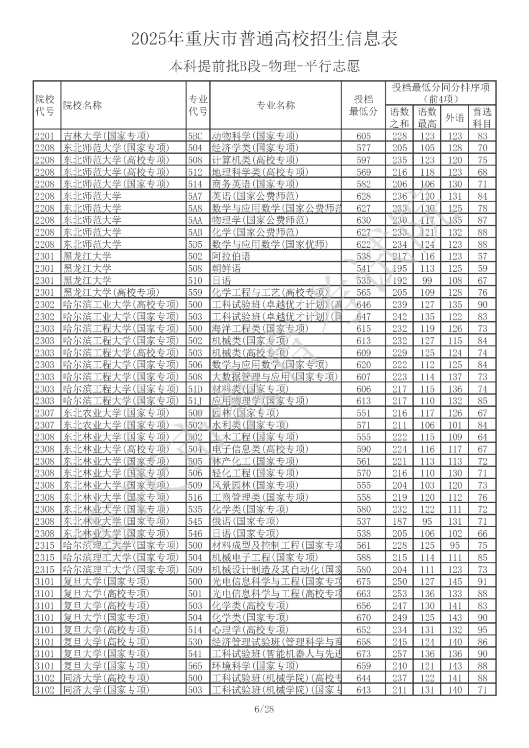 2025年重庆市普通高校招生信息表 普通类本科提前批B段(物理类)信息已发布,具体内容如下: