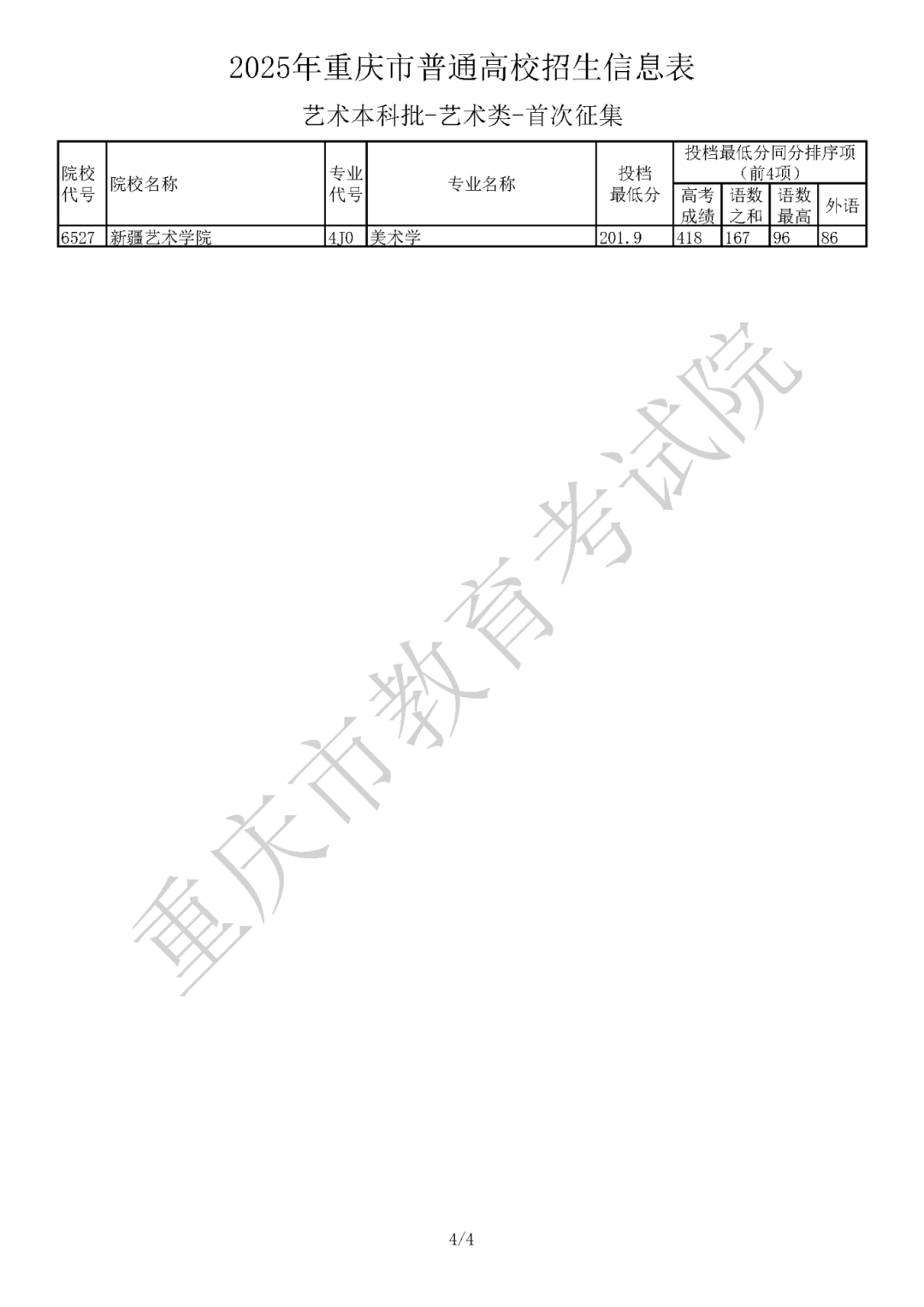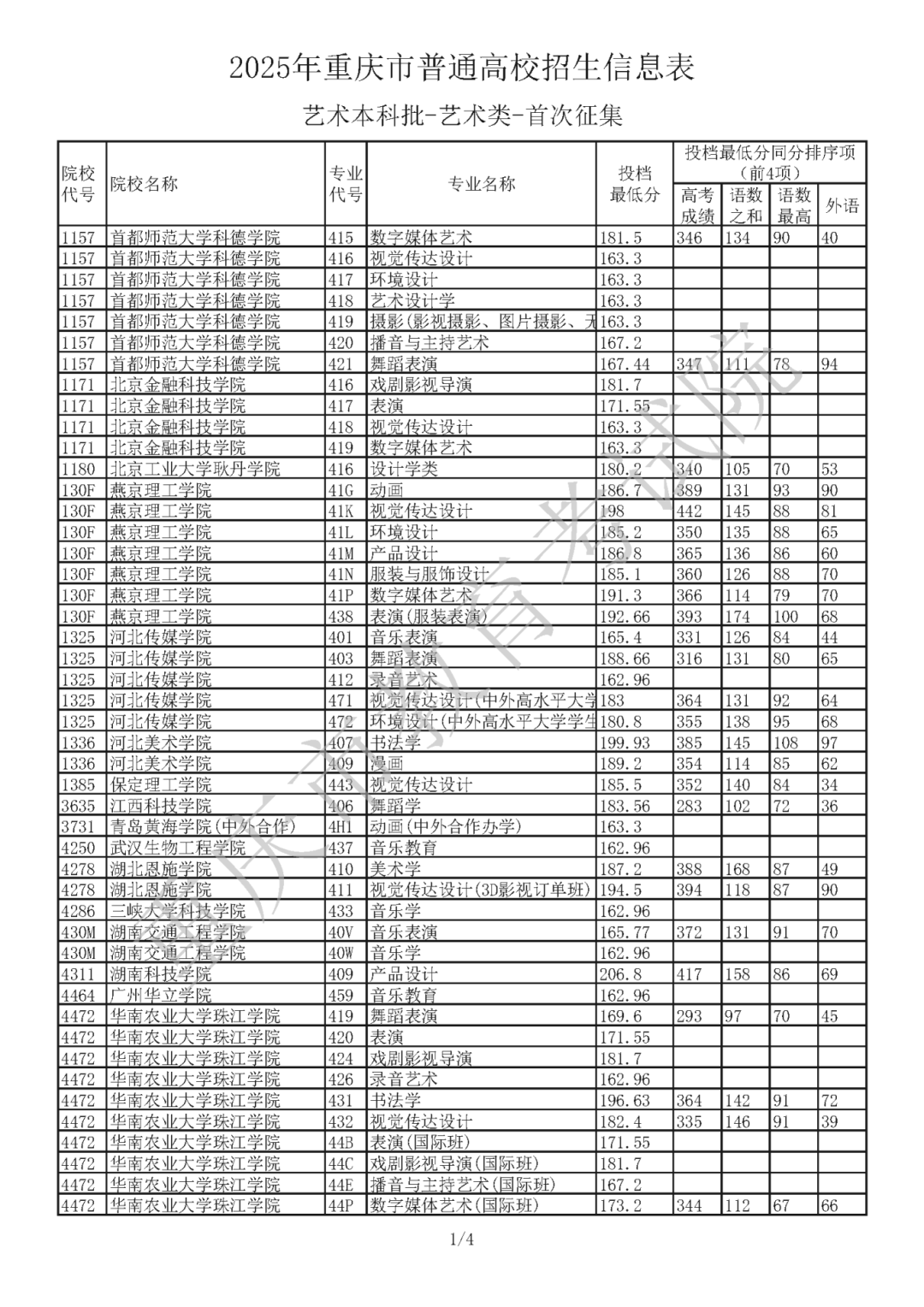 2025年重庆市普通高校招生信息表 艺术本科批(首次征集)