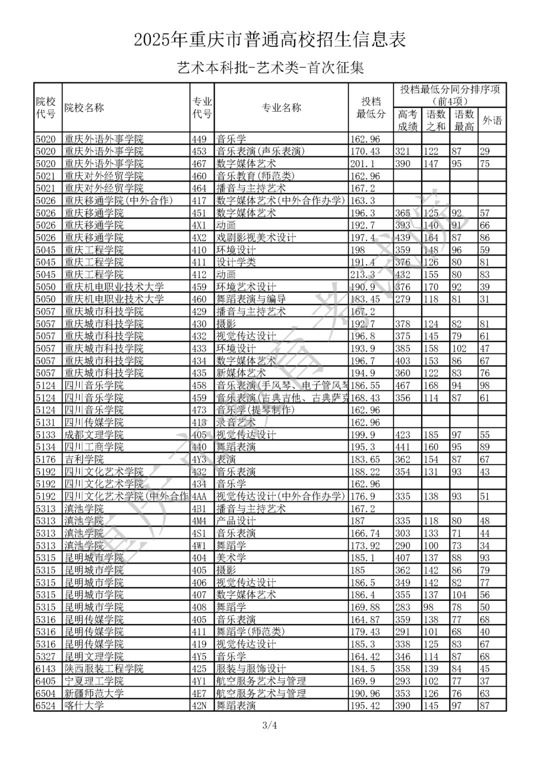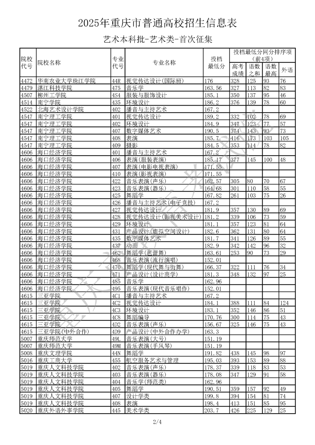 2025年重庆市普通高校招生信息表 艺术本科批(首次征集),具体信息如下: