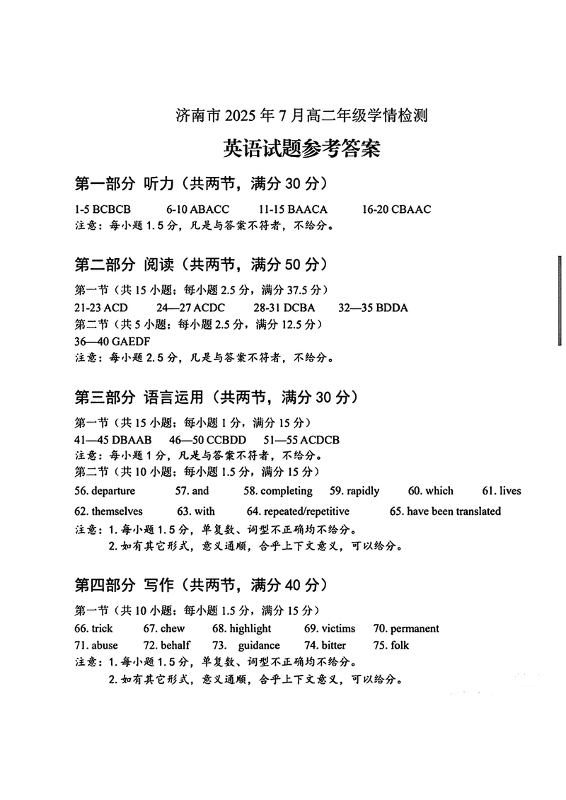 2025年7月济南市高二期末学习质检英语试题及答案 时间:2025-07-18 山东 英语试题 2025年7月济南市高二期末学习质检英语考试已于近日开考,为方便考生考后及时查看考试情况,查漏补缺、弥补不足,本文整理了试题答案解析相关信息! 汇总:2025年7月济南市高二期末学习质检 英语试题及答案解析