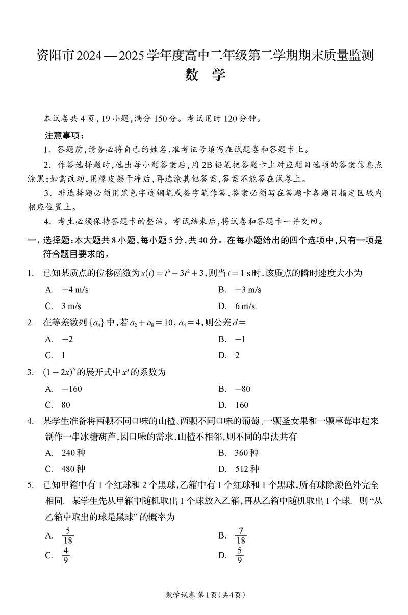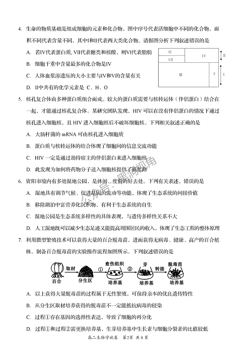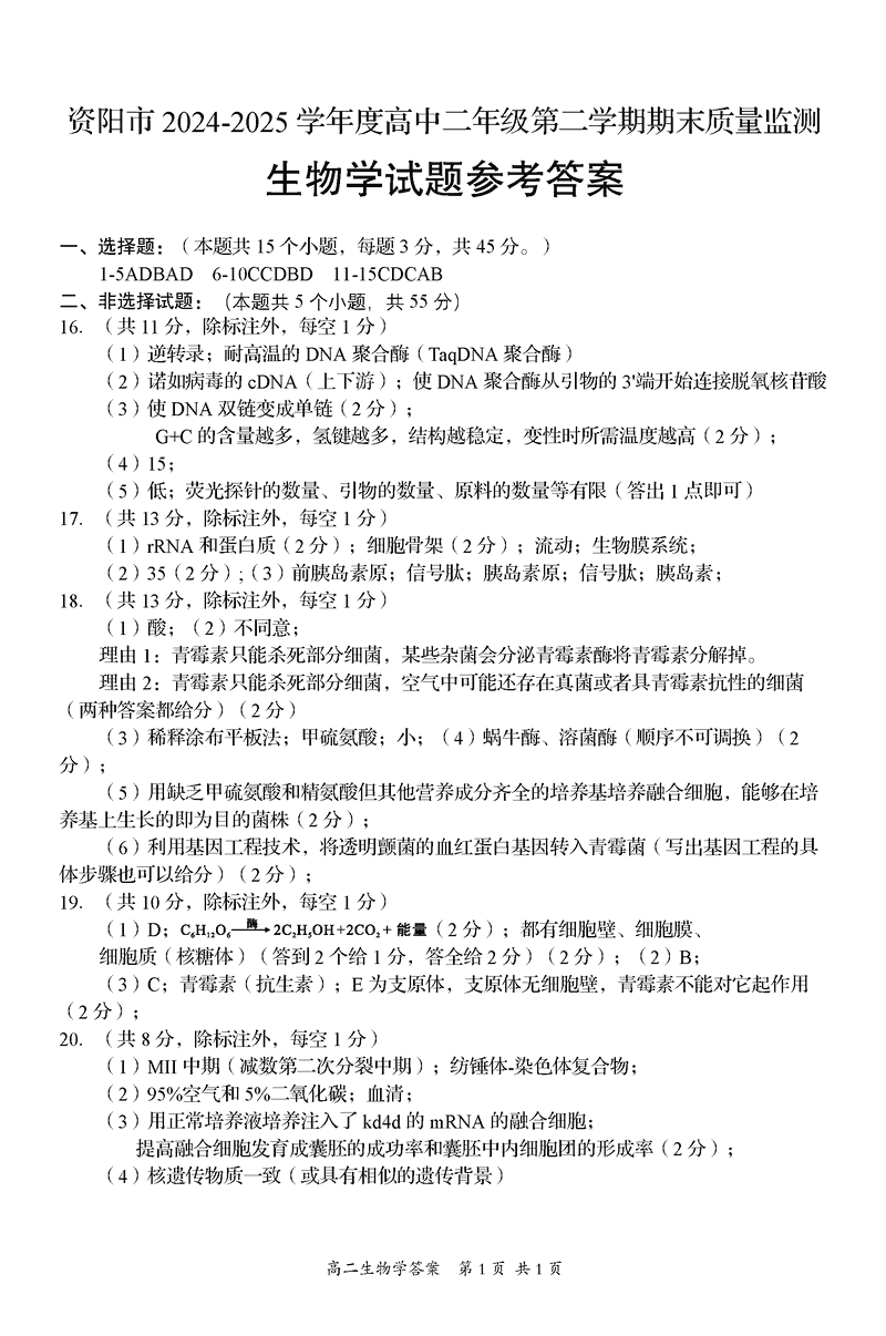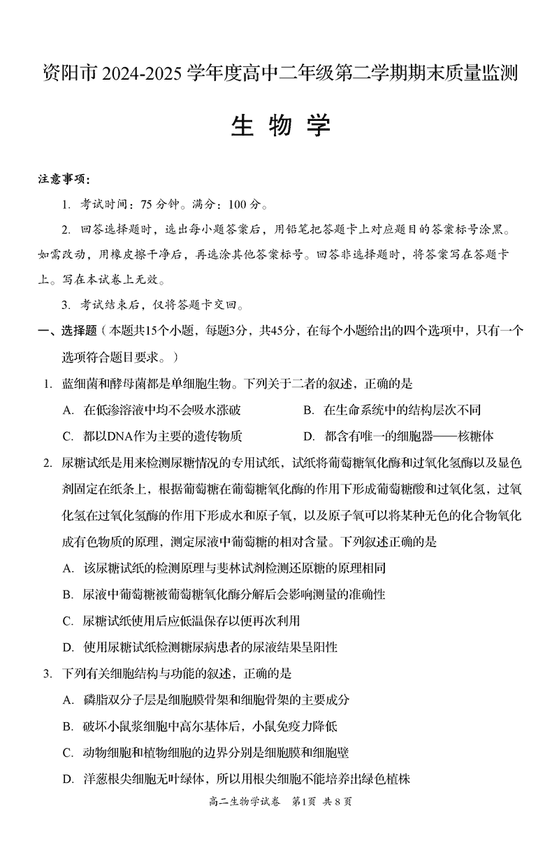 资阳市2024-2025学年高二下学期期末生物试题及答案 时间:2025-07-18 四川 理综试题 四川省资阳市2024-2025学年高二下学期期末生物考试已于近日开考,为方便考生考后及时查看考试情况,查漏补缺、弥补不足,本文整理了试题答案解析相关信息! 汇总:资阳市2024-2025学年高二下学期期末 生物试题及答案解析