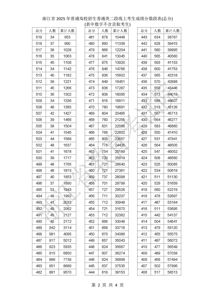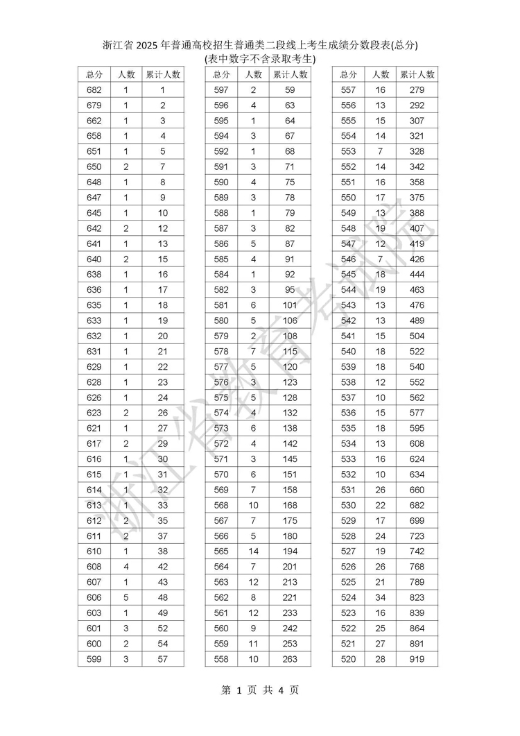 浙江省2025年普通高校招生普通类二段线上考生成绩分数段表(总分)已发布,具体内容如下: