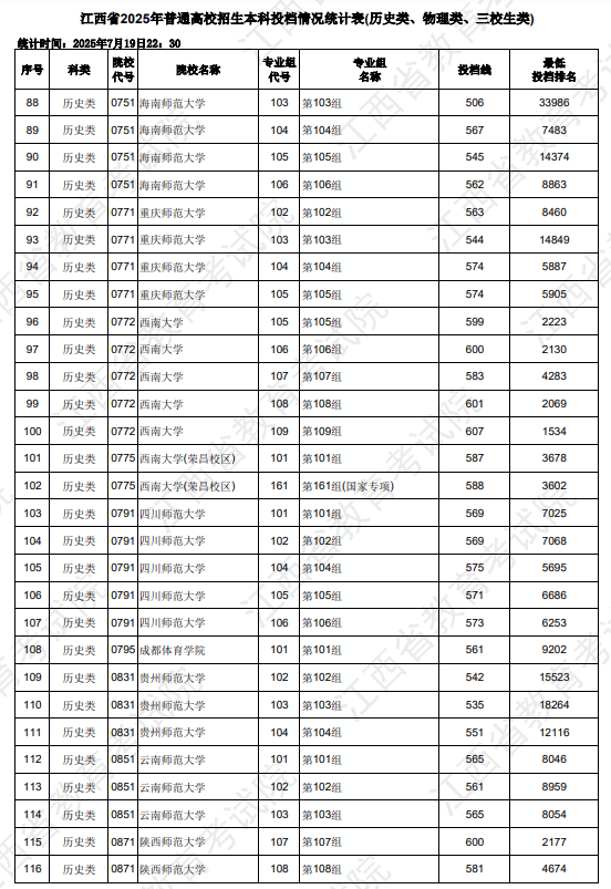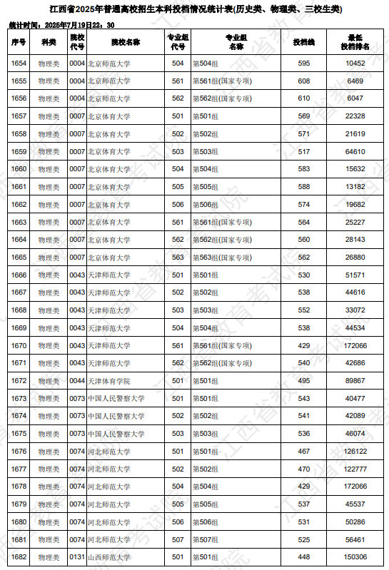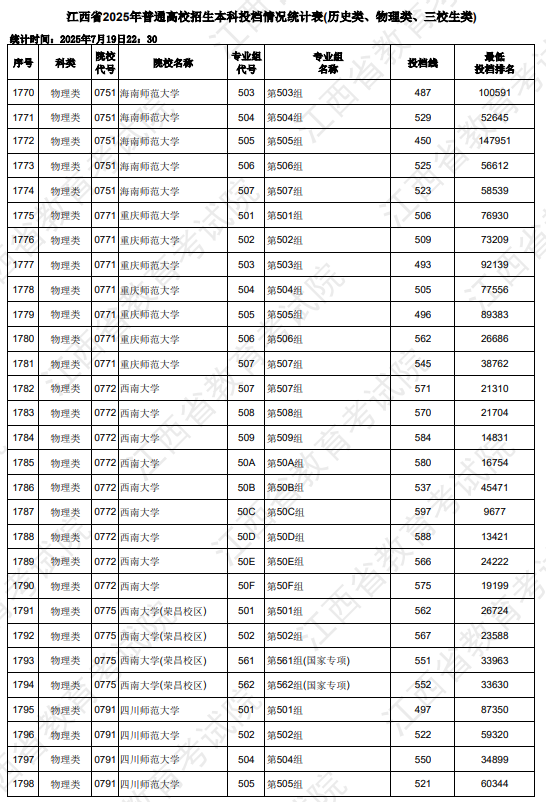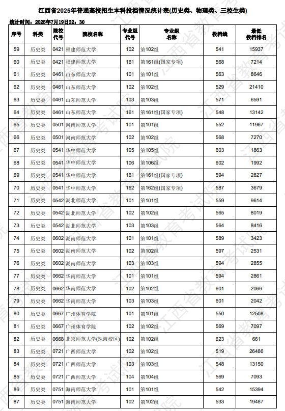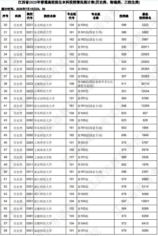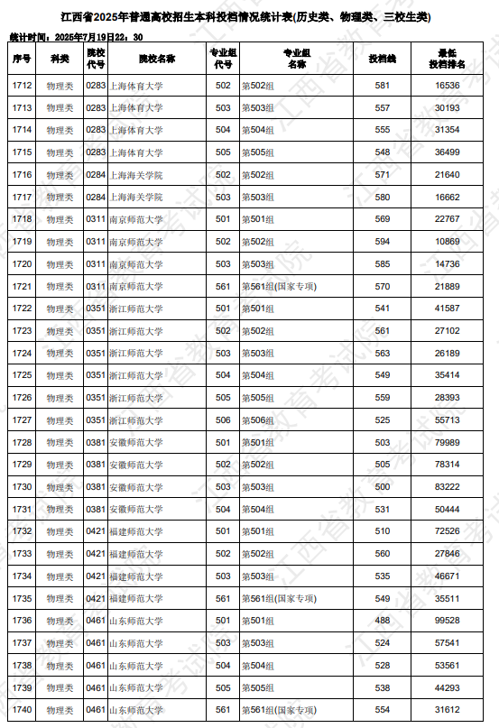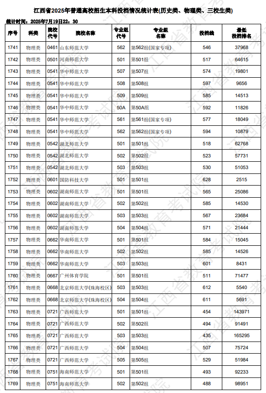 江西2025年普通高校招生本科批次的投档情况统计表正式公布: