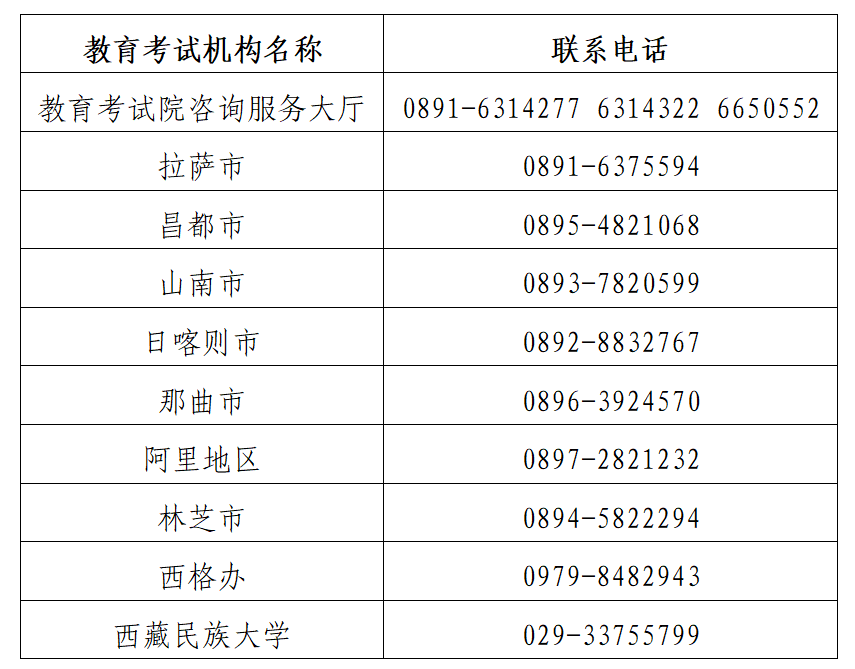 2.现场咨询:西藏自治区教育考试院咨询服务大厅,各地市教育局考试中心、西格办招生办、西藏民族大学招生办。