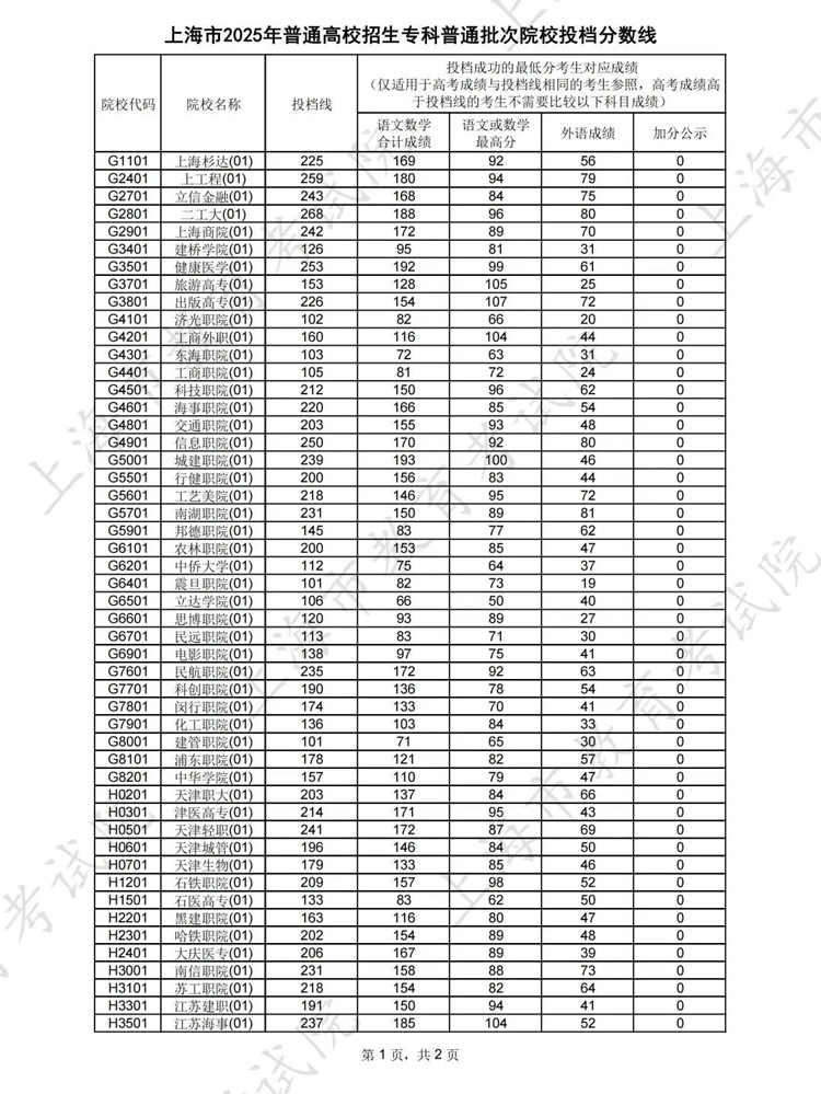 上海2025年专科普通批次院校投档分数线公布,具体内容如下: